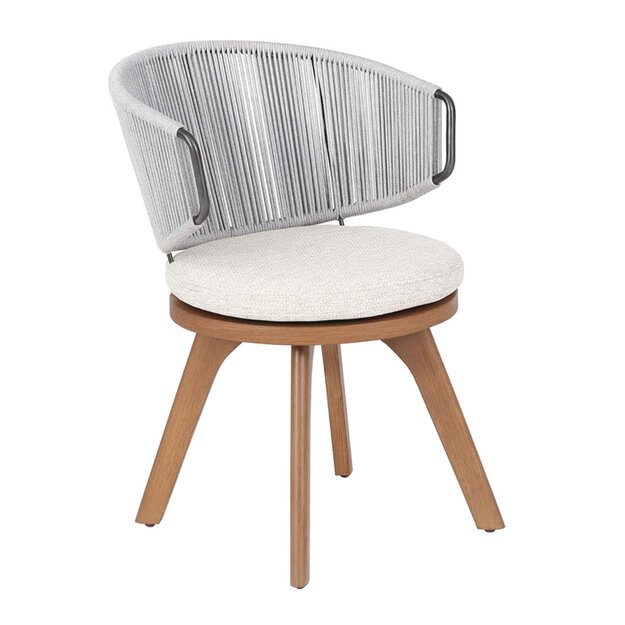 Elegantes Rope in edlem Silbergrau zieht sich über die rund geformte Rückenlehne aus schwarzem, spezial-beschichtetem Edelstahl. Eine runde Sitzfläche, die um 360 Grad drehbar ist, greift die Form der Rückenlehne wieder auf, und ein passgenaues Sitzkissen verleiht optimalen Komfort. Das Rope-Design verleiht dem Möbelstück eine luftige Leichtigkeit, die das Gleichgewicht zum massiven Gestell aus der Teak-Alternative FUREMA herstellt. Dieses Designmaterial imitiert die natürliche Optik und Haptik von Holz, ist nachhaltig und sowohl witterungs- als auch UV-beständig, wodurch das Produkt auch im Außenbereich lange seine Schönheit behält.