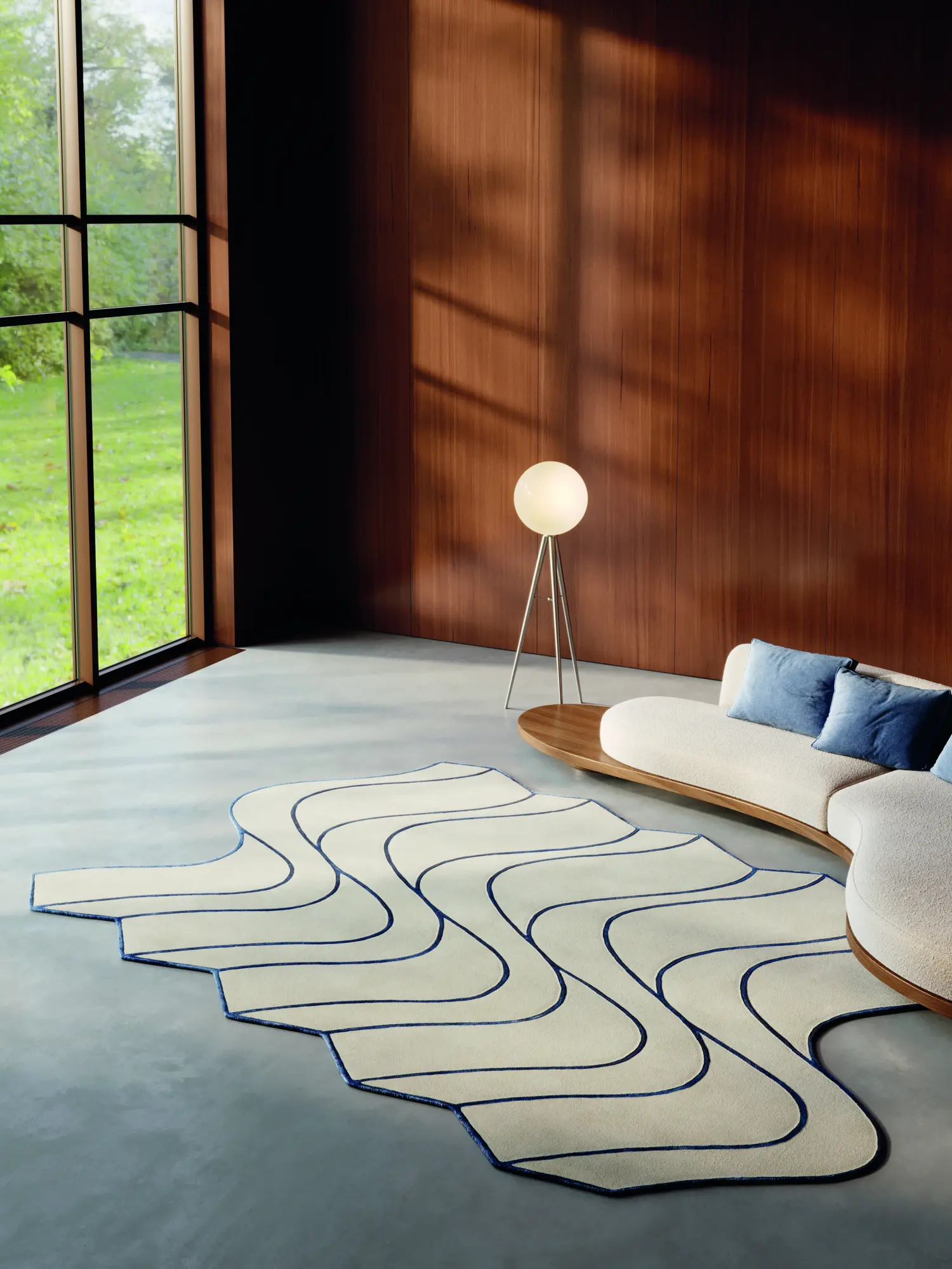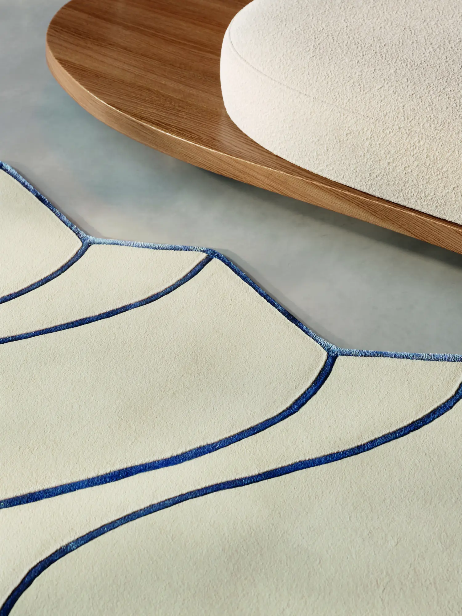 Fließend. Atmend. Frei. NAMI bringt unbändige Dynamik in dein Interior. Das sanfte Weiß hochwertiger Neuseelandwolle erdet und beruhigt, während das blau-schimmernde Tencel abstrakte Origami-Faltungen rebellisch zu einer skulpturalen Landschaft formt. Handgecarvte Linien zeichnen eine fühlbare Reliefstruktur, die an Wasser erinnert: weich im Rhythmus, tief in der Wirkung. Dieses Design vereint Ruhe und Intensität zu einem surrealistischen Statement.