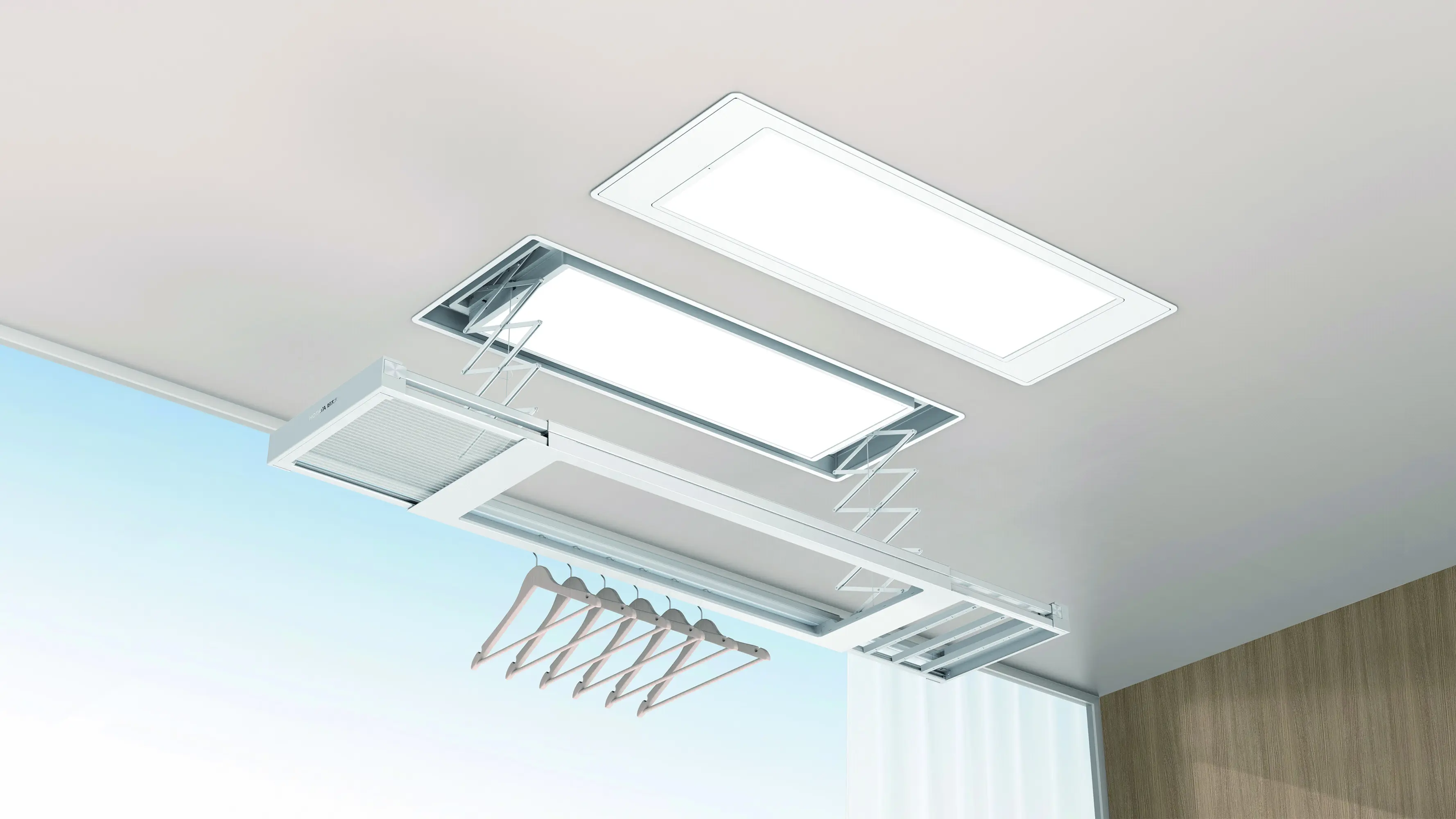 Der Wäscheständer lässt sich perfekt in die Balkondecke einbauen, entspricht dem "minimalistischen Expansions"-Lebensstil der Nutzer und gewährleistet eine maximale Lichtnutzung. Er verfügt über ein neues winddichtes und lochfreies Trockenstabdesign, das ein unbehindertes Aufhängen und Entnehmen von Wäsche ermöglicht und 50 % der Trocknungszeit spart. Zudem erfüllen die links-rechts versteckten Trockenfächer und die oben-unten geschichteten Trockenstäbe die Bedürfnisse der Nutzer nach Doppelschichtentrocknung von viel Wäsche sowie "gesunder partitionierter Trocknung".