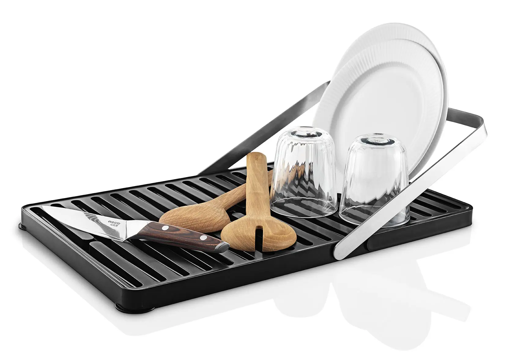 Schluss mit Stapeln von schmutzigem Geschirr in der Spüle. Das Abtropfgestell organisiert den Abwasch, hält die Arbeitsfläche trocken und lässt Teller, Glas und Besteck bequem von selbst trocknen. Das Gestell ist aus 90 Prozent Post-Consumer-Recycling-Kunststoff und Edelstahl gefertigt und besitzt eine schräge Abtropfschale, die das Wasser ableitet. Wenn der Abwasch beendet ist, kann das Gestell zusammengeklappt und im Küchenschrank verstaut werden.