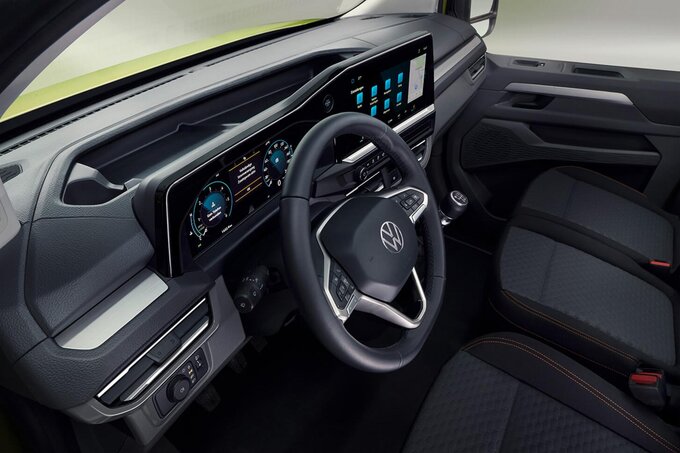 Größer gedacht: Das Interieur des neuen Transporters ist Fahrerearbeitsplatz, Büro und Pausenraum in einem. Mit dem Digital Cockpit behalten Sie unterwegs den Überblick, während die modernen Assistenzsysteme Ihren Arbeitsalltag erleichtern. In der HMI wurden bekannte Bedienparadigmen aus der Consumer Electronic in den automobilen Kontext überführt und bieten ein intuitives Benutzererlebnis. Die neue marken-typische Designsprache integriert die digitalen Anzeigen nahtlos in die Interior-Architektur und macht aus dem Transporter einen modernen und zeitlosen Begleiter.