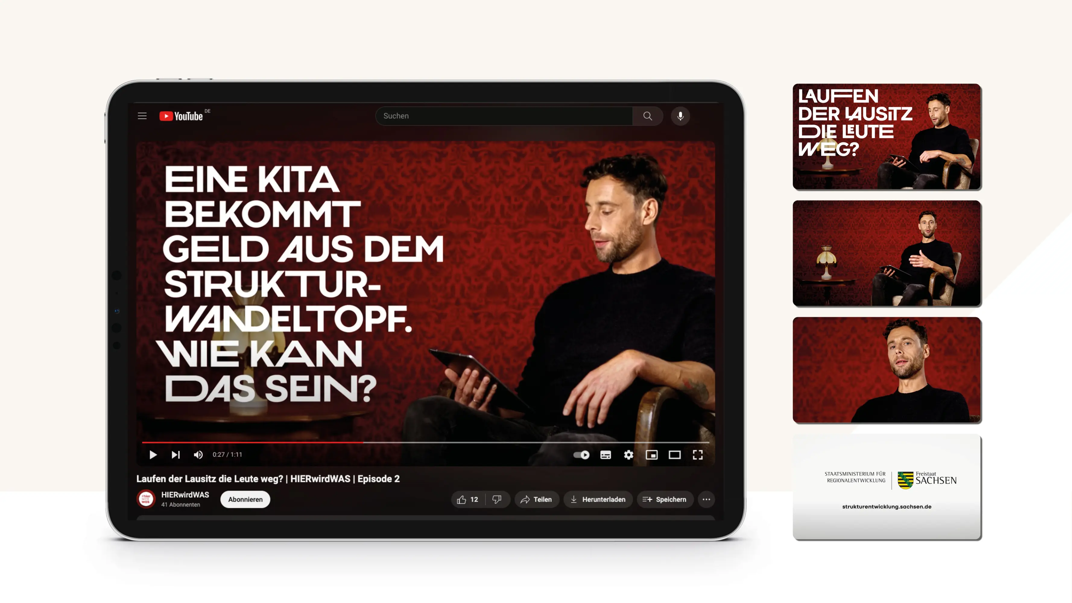 Mit dem Braunkohleausstieg muss sich Ostsachsen neu erfinden. Bürger:innen nehmen die Herausforderung an, entwickeln Lösungen, um Arbeitsplätze zu ersetzen. In enger Zusammenarbeit mit dem Sächsischen Staatsministerium für Regionalentwicklung entstand eine Kampagne, die diejenigen zu Wort kommen lässt, die eine Vorreiterrolle einnehmen. In kurzen Filmen kontern die Akteure Klischees mit Augenzwinkern und guten Argumenten. Die Filme folgen den Sehgewohnheiten der Zielgruppe und treffen einen einzigartigen Ton. Zahlen und Fakten untermauern die Aussagen.