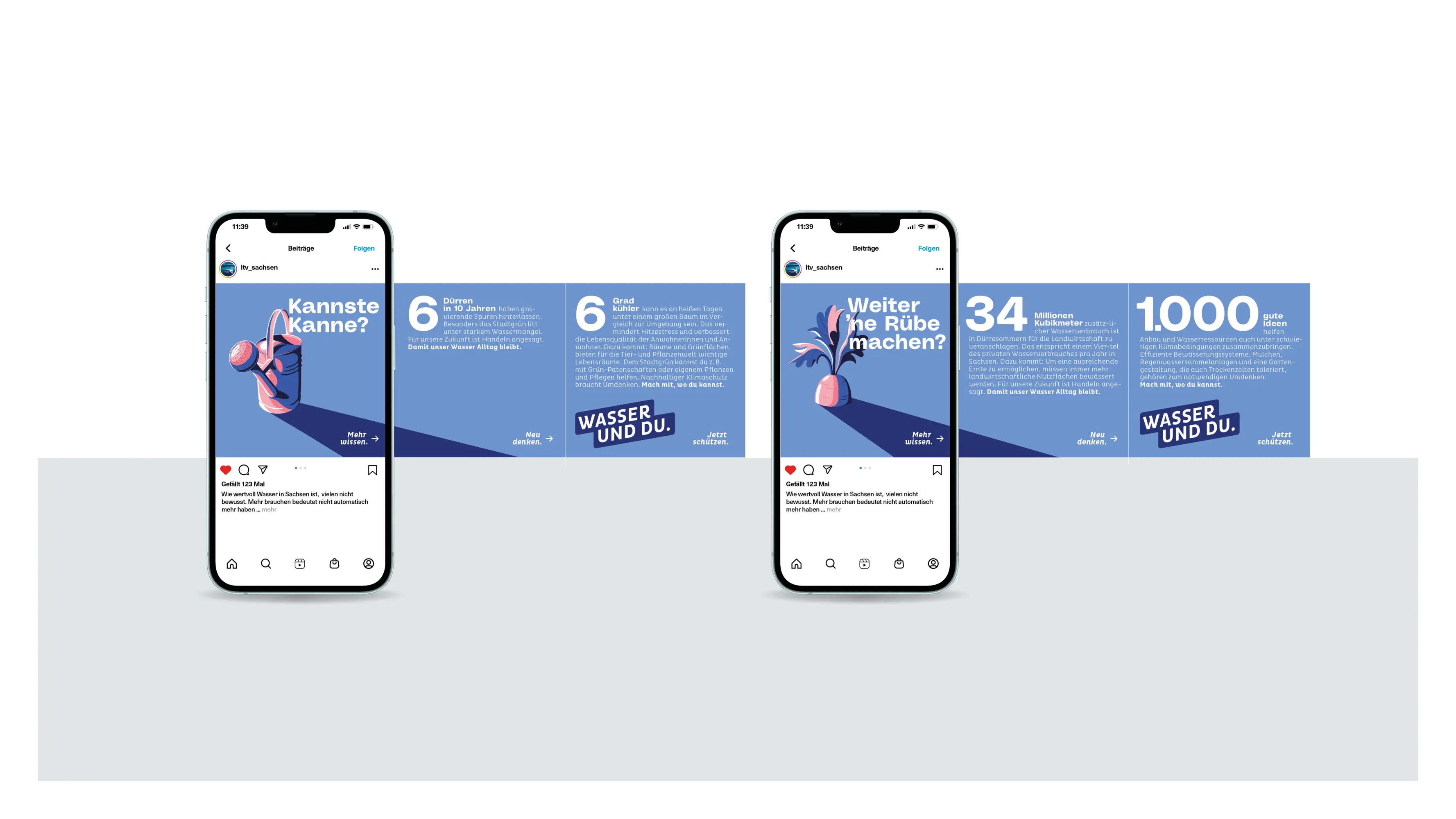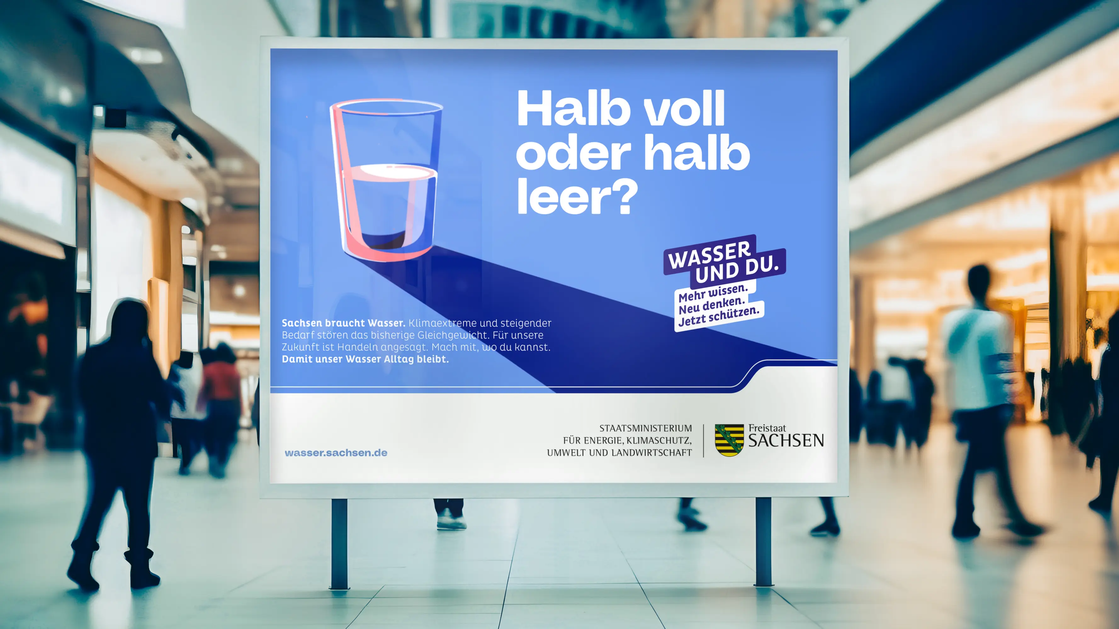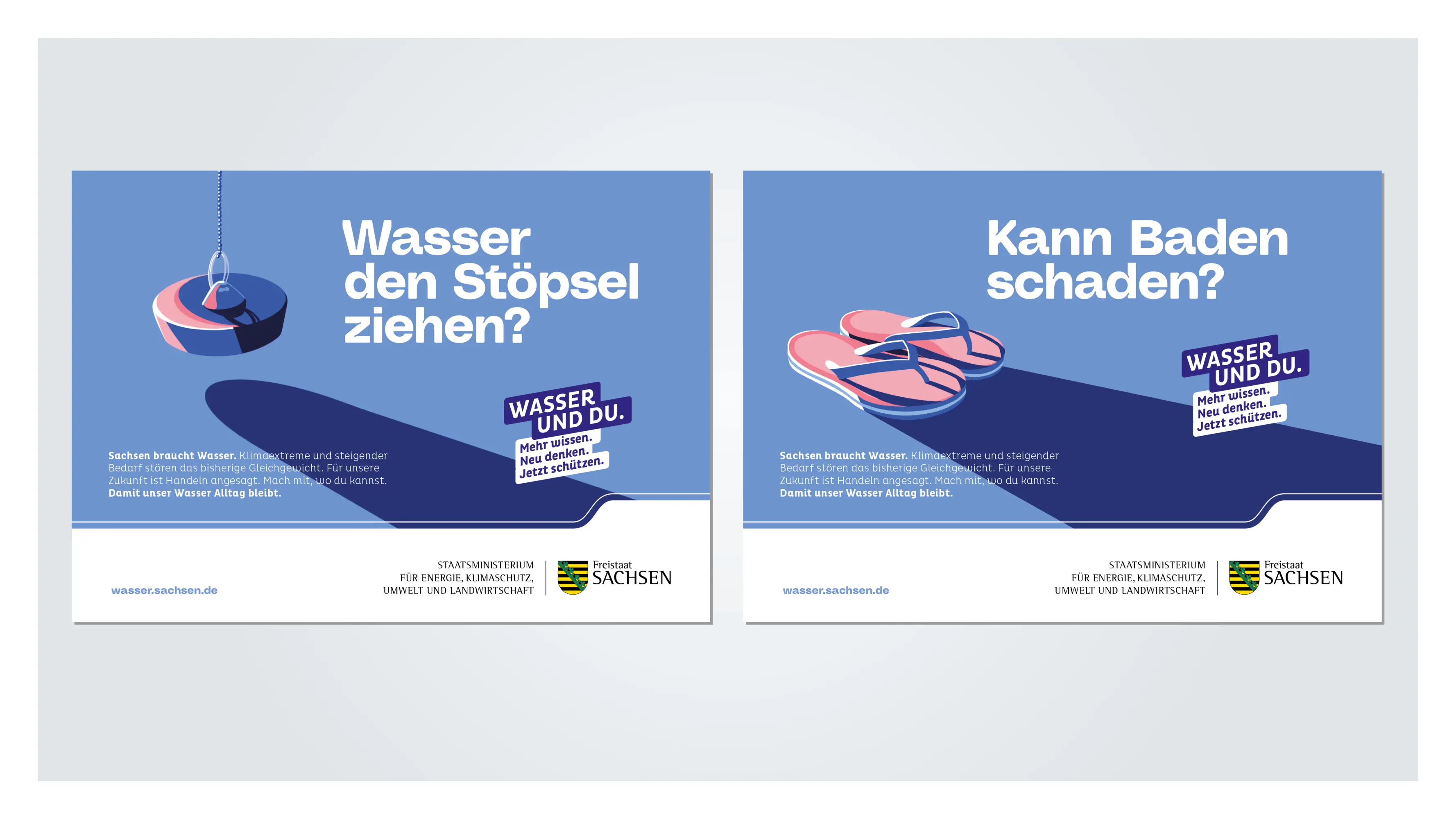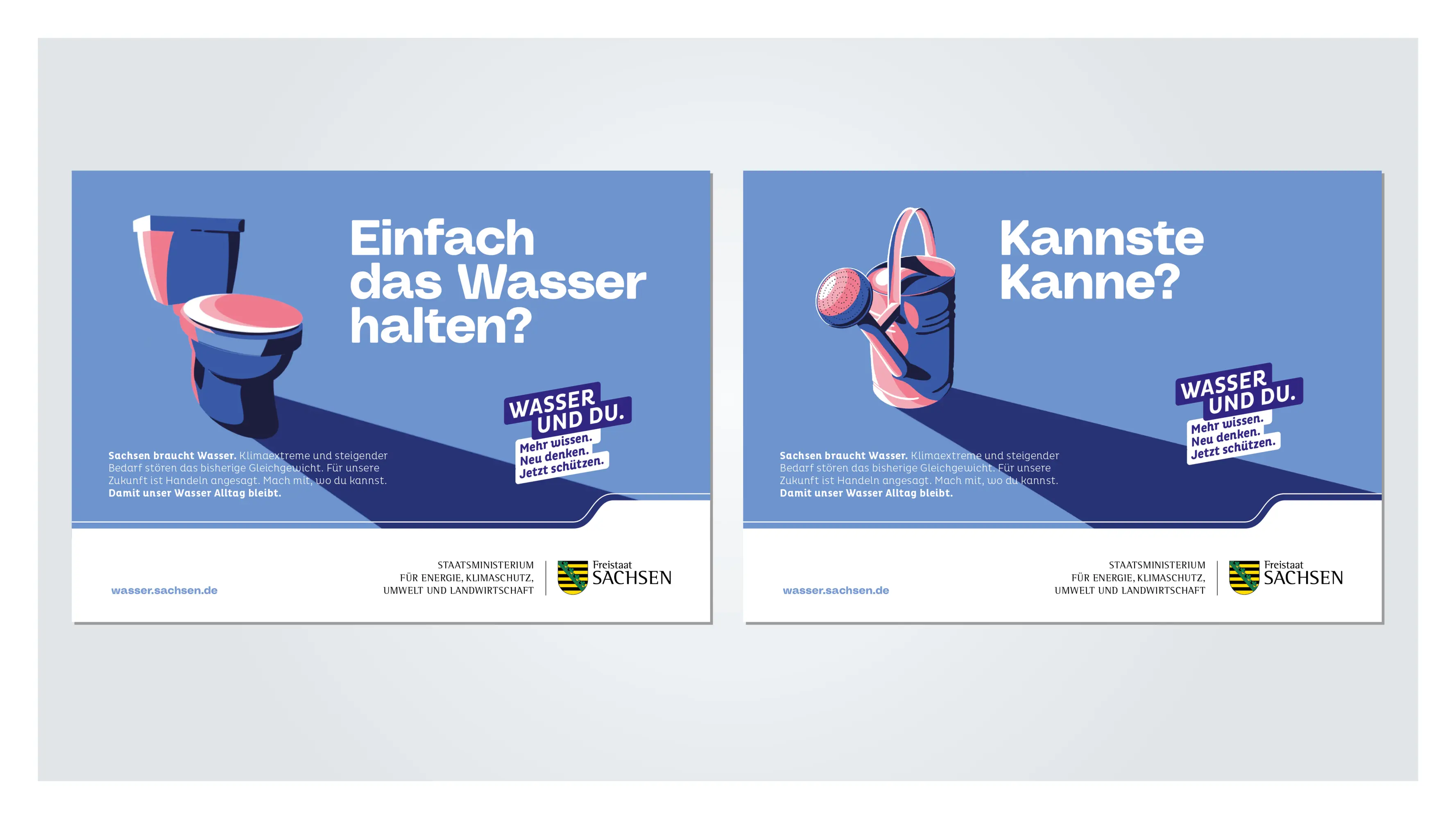 Wasser ist ein kostbares, weil knappes Gut. In einigen Teilen Sachsens ist die Situation dramatisch. Das sächsische Umweltministerium wollte gemeinsam mit seinen Behörden die Bevölkerung für das Thema sensibilisieren. Eine prägnante Kampagne regt zum Nachdenken an. Markante Motive machen aus Reduktion eine visuell starke Tugend und ziehen an. Die Aufforderung wird zum Ausgangspunkt für Thema, Problem, Erkenntnis, Einsicht und Lösung. Ein flexibles Erscheinungsbild ermöglicht einen mehrstufigen inhaltlichen Ansatz und eine zeitnahe Reaktion auf Ereignisse.