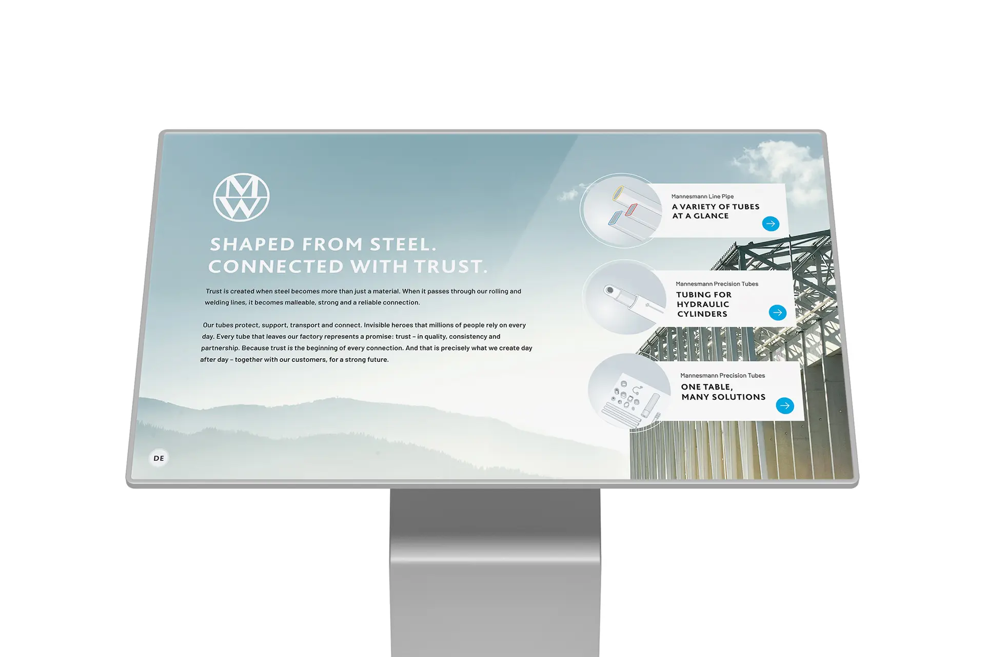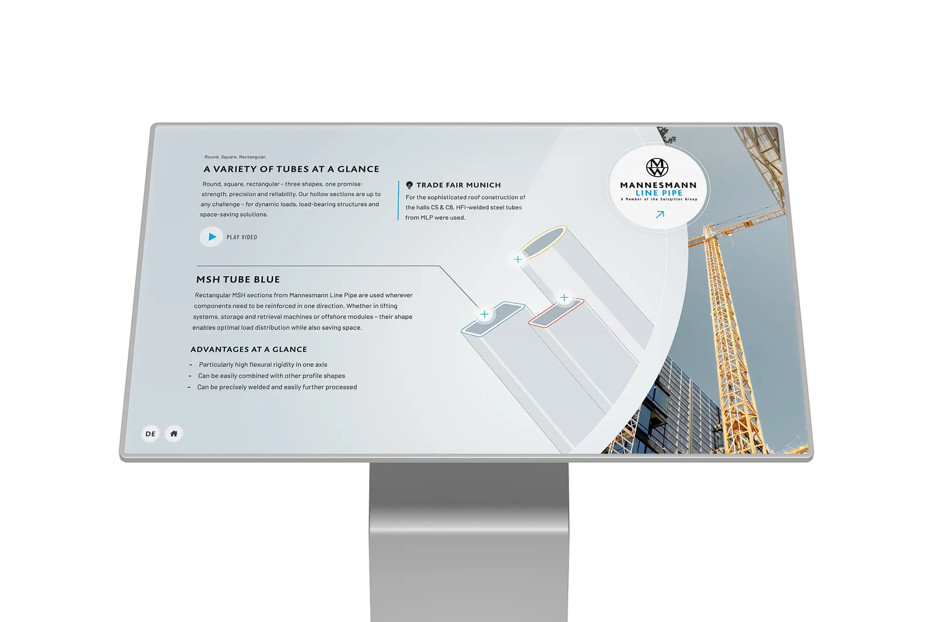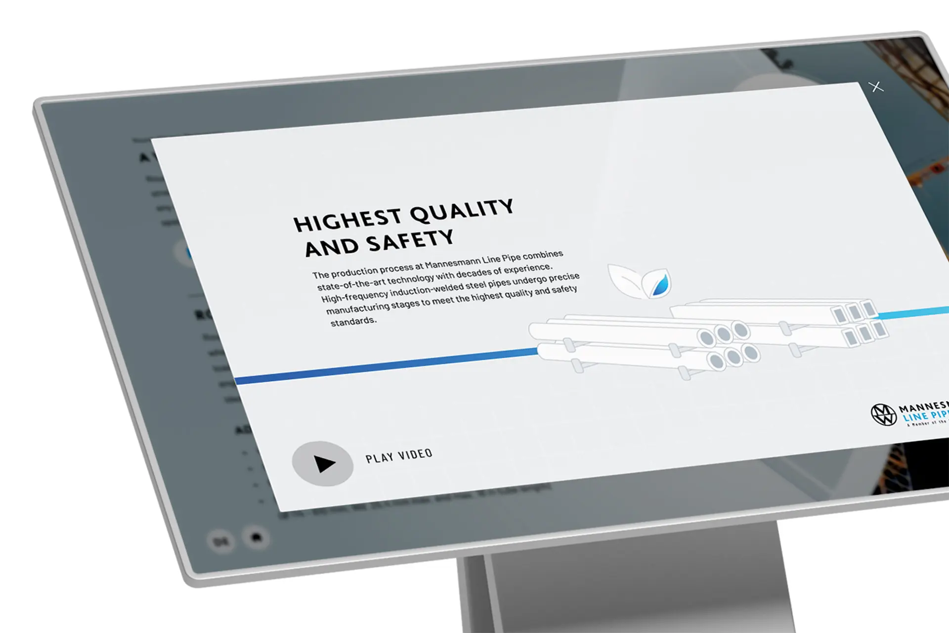 Mit unserer Messeapplikation werden die Exponate unseres Kunden zum Leben erweckt: Besucher erhalten die Möglichkeit, in die Potentiale der ausgestellten Rohre einzutauchen und per Touchscreen zu erleben. Interaktive Features, eine hochmoderne Nutzerführung und eine visuell prägnante Gestaltung bringen komplexe Inhalte auf den Punkt. Für das internationale Publikum sorgen mehrsprachige Erklärvideos für eine verständliche und effiziente Wissensvermittlung. Mit der Applikation vereinen wir präzises Design mit technischer Stabilität und schaffen so ein Tool, das Messeauftritte transformiert und die Markenwirkung nachhaltig stärkt.