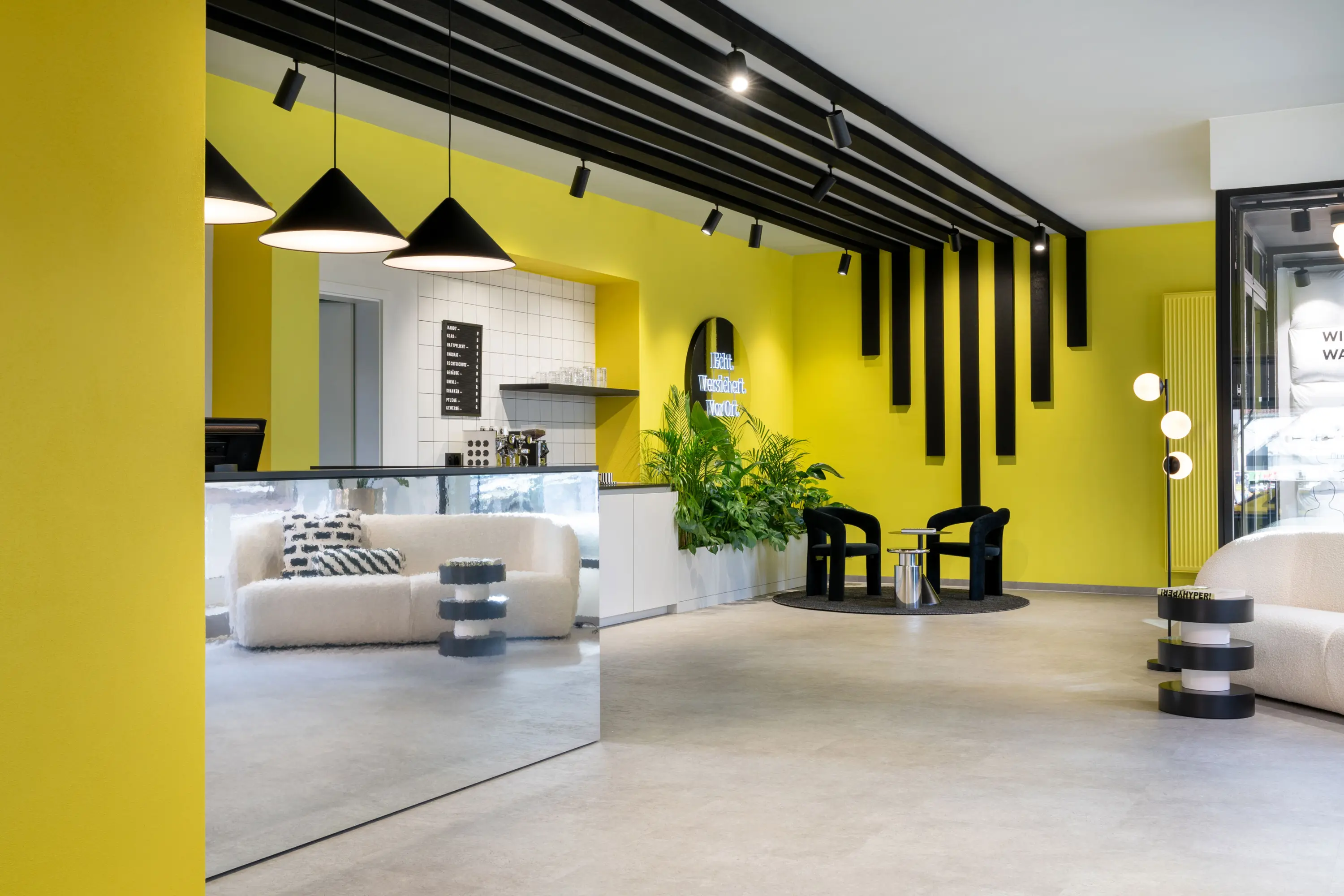Mit dem Umzug in die neuen Räumlichkeiten in der Dachauer Altstadt beginnt für die Mecklenburgische Versicherung ein neues Kapitel. Die Gestaltung von Sebastian Zenker setzt die Unternehmensfarben Gelb, Schwarz und Weiß konsequent um. Highlight ist das abstrakt an der Decke inszenierte Logo aus Akustikstreifen, das von außen sichtbar ist. Ein verspiegelter Empfangstresen, eine puristische Kaffeestation, gelbe Akzente, verspielte Möbel und Bepflanzung prägen das Ambiente. Wohnlich gestaltete Arbeitsplätze mit Teppichen und Sitznischen schaffen ein modernes, funktionales Umfeld, das die Identität der Versicherung widerspiegelt.