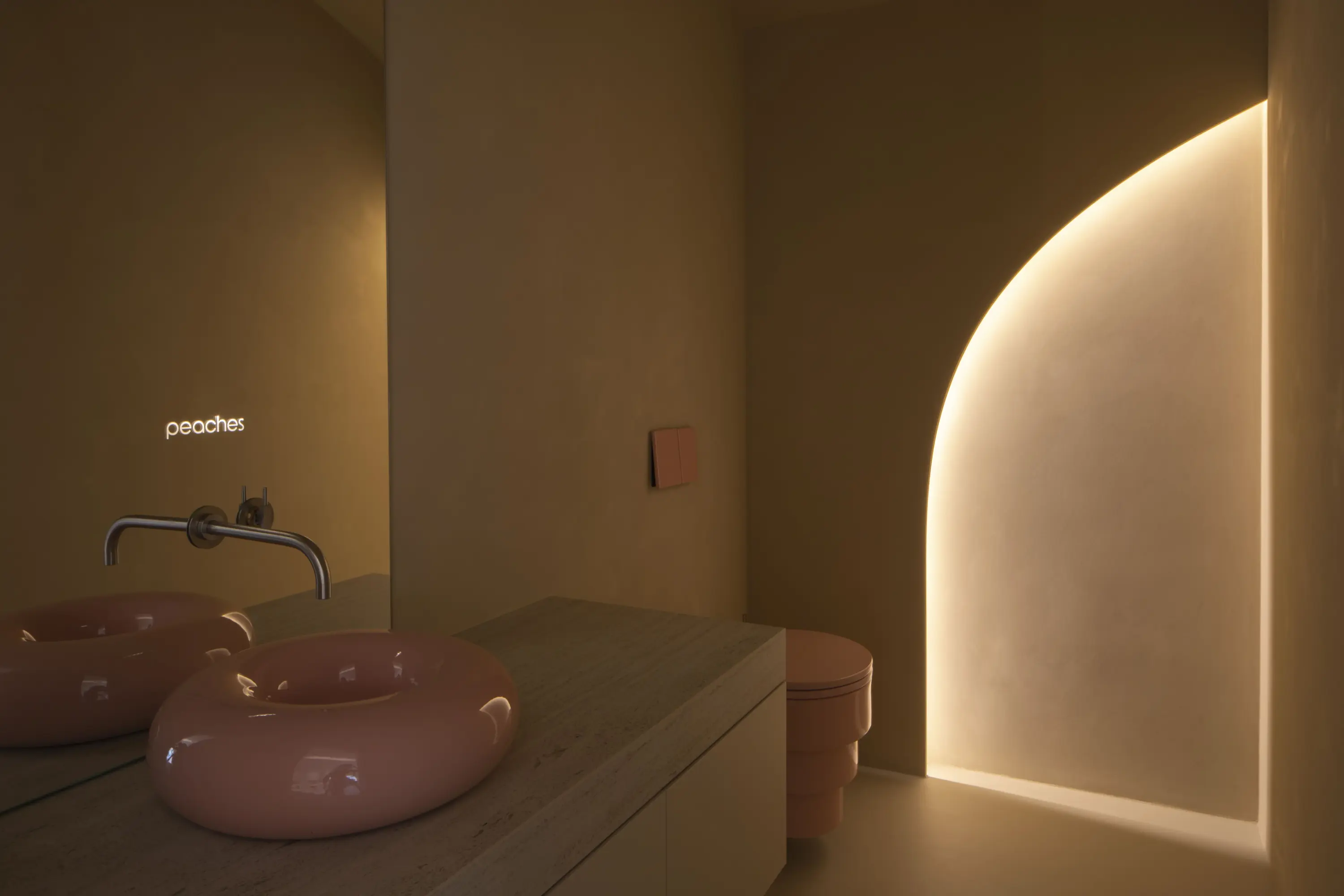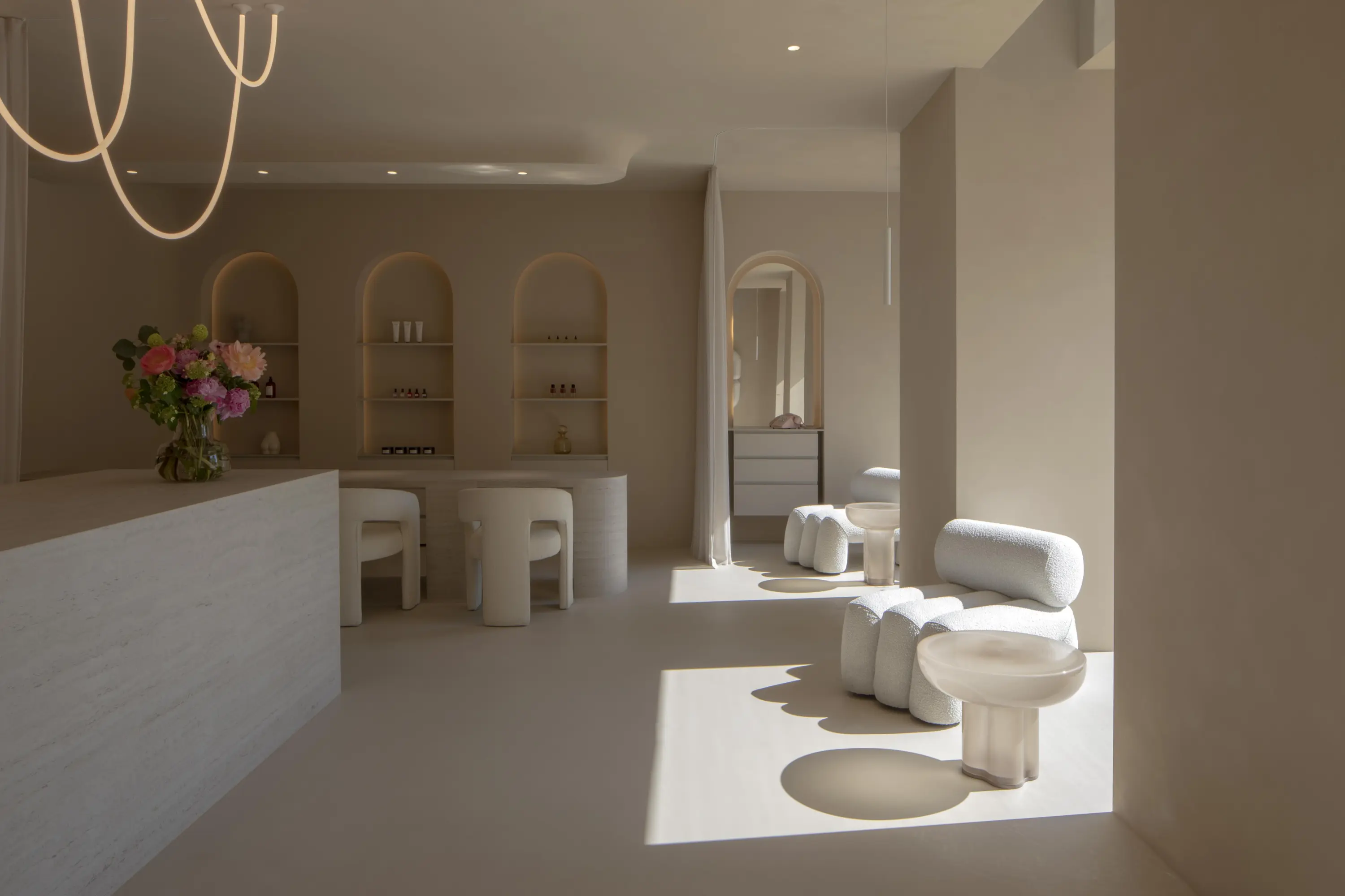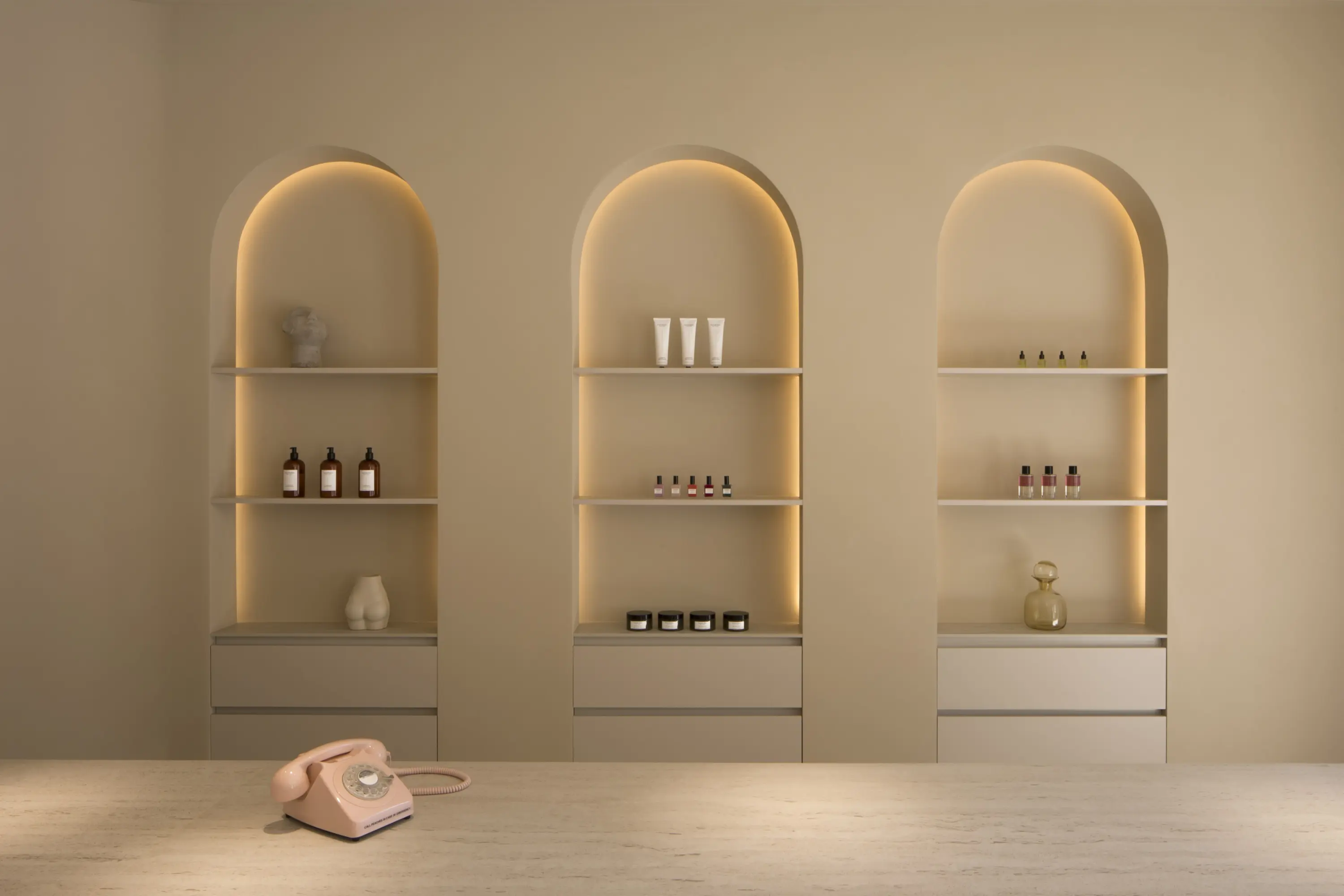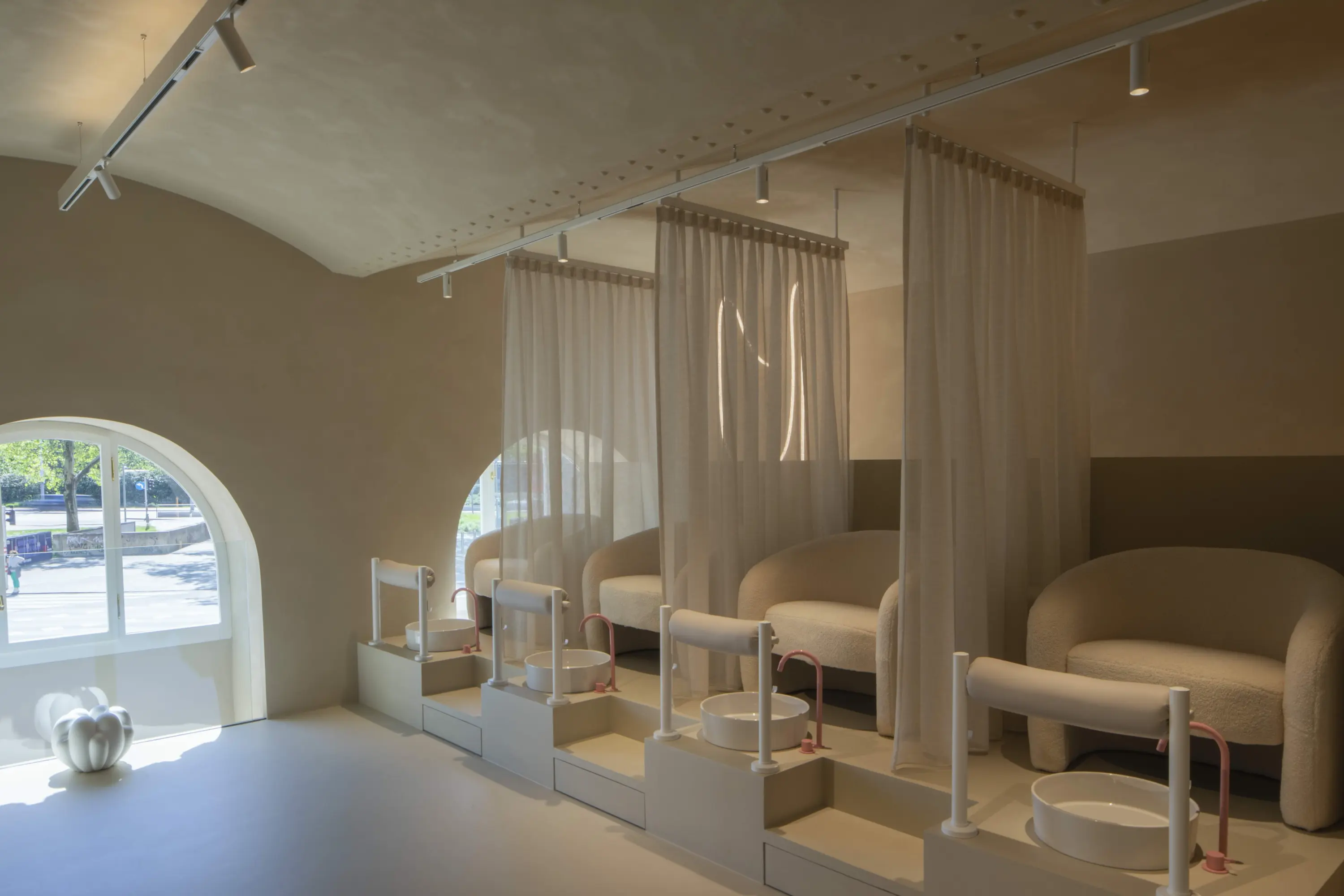 Mit Peaches, einem exklusiven Nagelstudio in prominenter Lage am Wiener Karlsplatz, schafft Destilat ein stimmungsvolles Raumerlebnis, das sich durch klare Formensprache, hochwertige Materialität und subtile Spannung vom Gewohnten abhebt. Die Gestaltung des Interiors basiert auf dem Prinzip homogener Flächen – Boden, Wand und Decke verschmelzen visuell durch eine aufwändige Spachteltechnik zu einem ruhigen, nahezu skulpturalen Gesamtkörper. Übergänge zwischen den Bauteilen sind teils weich gerundet, was die monolithische Wirkung des Raumes verstärkt und ihn gleichzeitig entmaterialisiert.