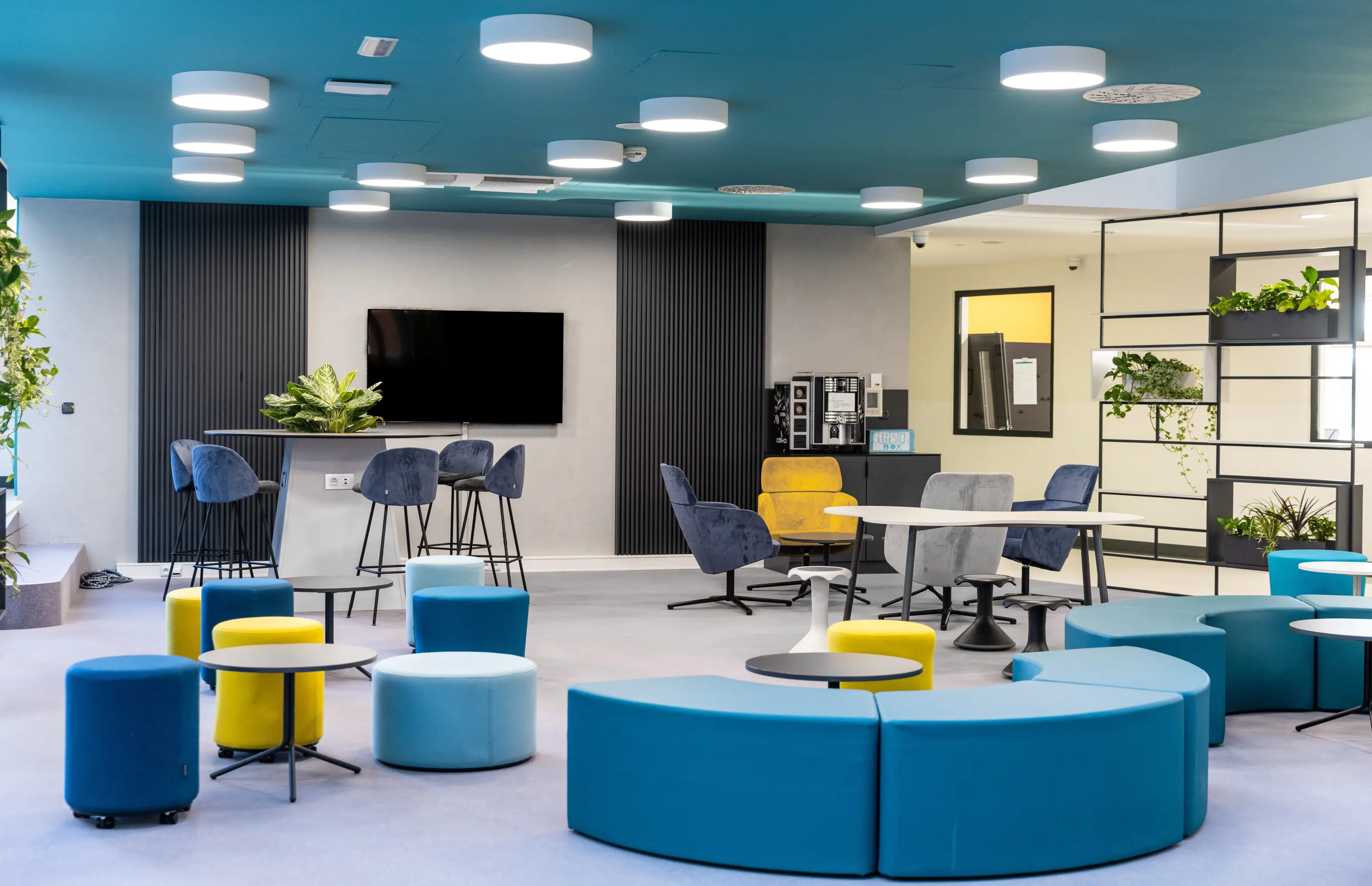 Die Innenraumstudie umfasste eine neue konzeptionelle Gestaltung des Schuleingangs und des zentralen Hauptbereichs, sowohl aus funktionaler als auch aus ästhetischer Sicht. Der Empfangsbereich ist offen und bildet den zentralen Knotenpunkt zwischen den einzelnen Räumen der Schule. Die Akustik des Raumes wird durch die Wahl des Bodenbelags und eine spezielle perforierte Gipskartondecke deckenbasiert. Um den ergonomischen Komfort zu erhöhen, wurden dort besonders bequeme Sitzgelegenheiten platziert und neue Beleuchtungsobjekte entworfen, die zugleich das zentrale ästhetische Element des Eingangsbereichs bilden, der buchstäblich leuchtet.