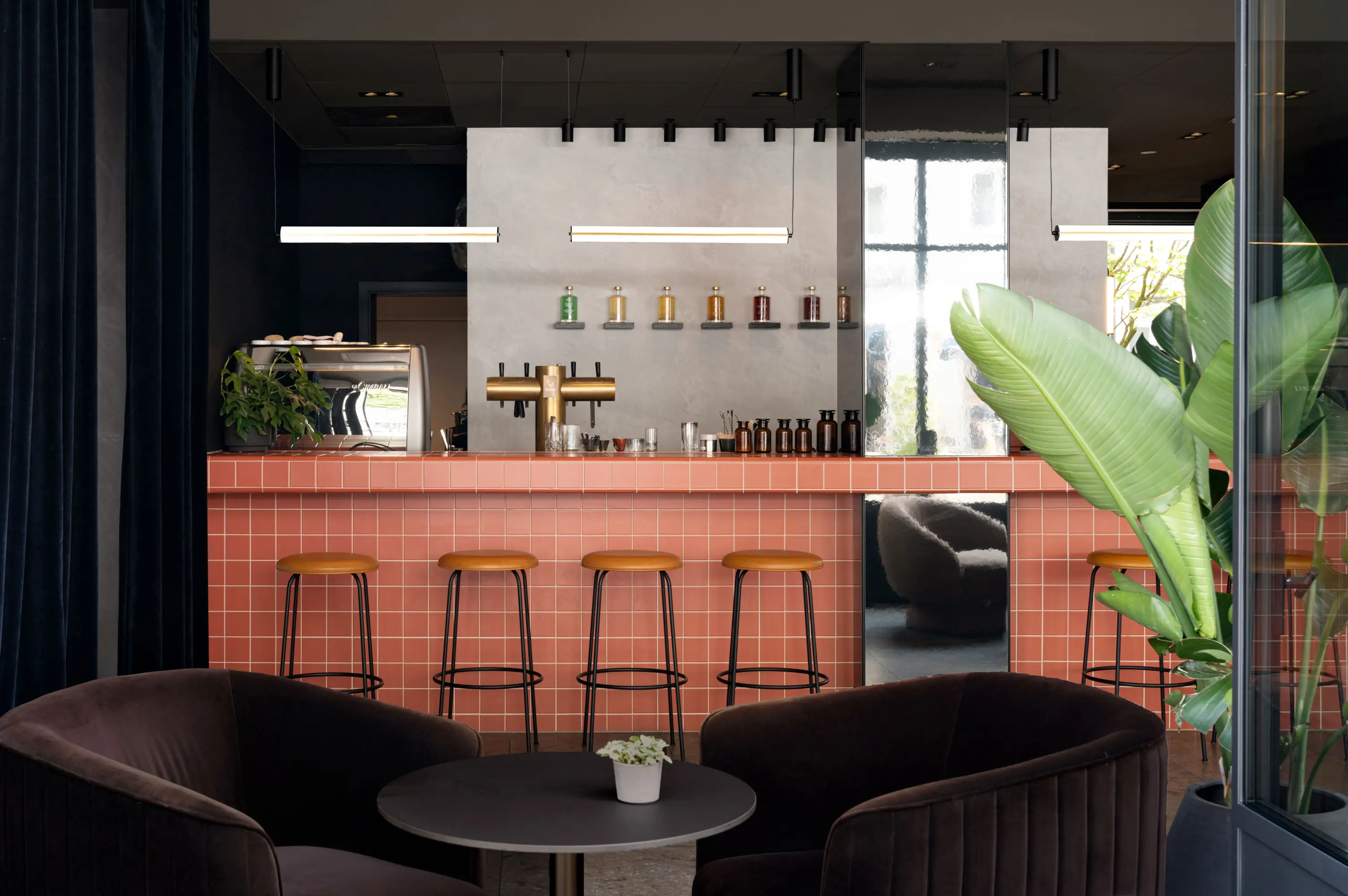 Die TERRA BAR ist ein lichtdurchfluteter, multifunktionaler Raum, weit entfernt vom klassischen Frühstücksraum. Terrakotta als Leitfarbe, edle Erdtöne, cognacfarbenes Leder und industrielle Elemente aus dem Bestand prägen das charakterstarke Interior. Die stylische Bar ist das Herzstück des Hotels und zugleich die erste Bar Deutschlands, die ausschließlich Bottled Cocktails serviert. Nachhaltig gedacht und hochwertig gestaltet – mit upgecycelten Möbeln, verspiegelten Säulen und Kunstwerken der Münchner Künstlerin Hanna Klingseisen. Ein Ort zum Verweilen, Erleben und Genießen – Tag und Nacht.
