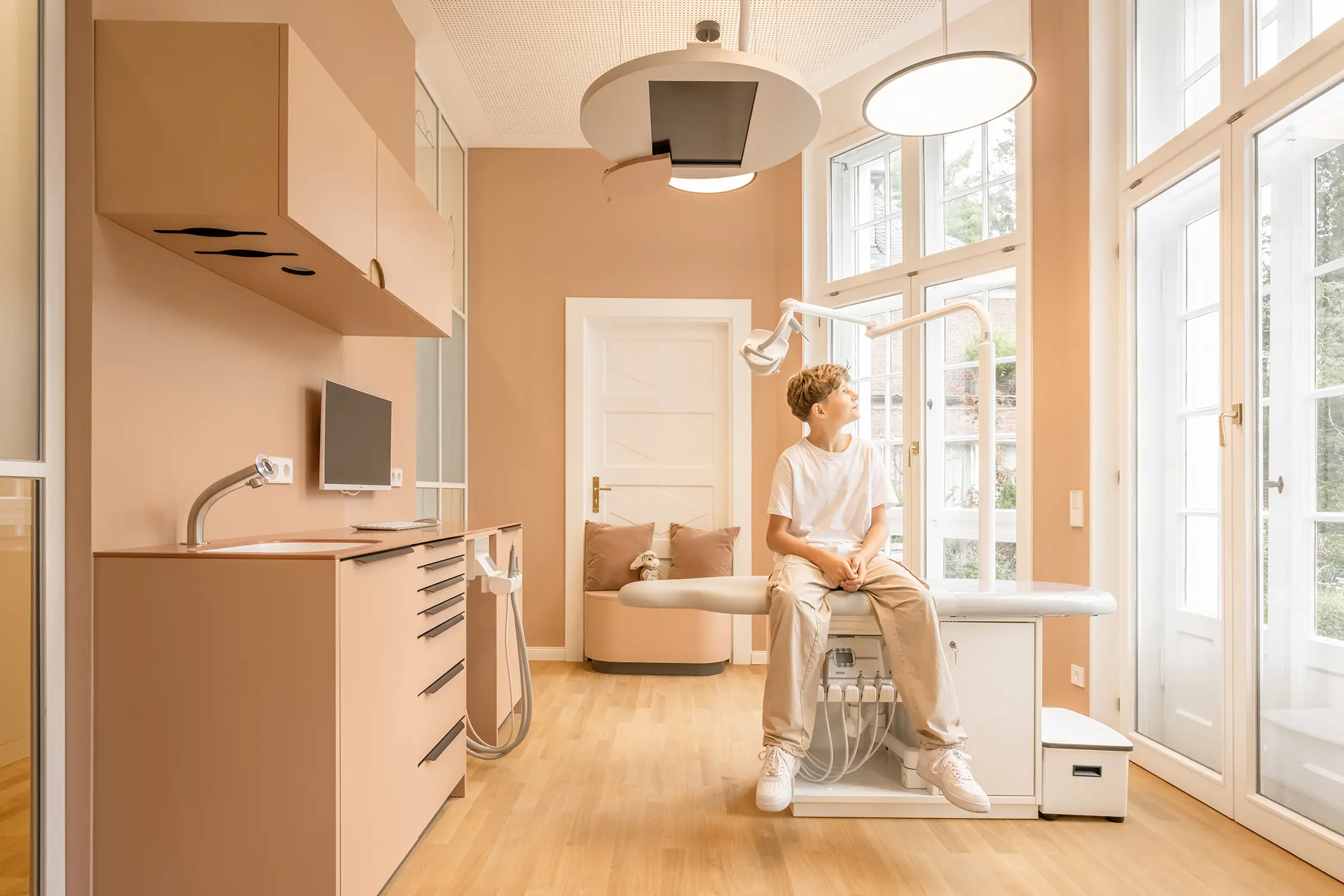 Alte Mauern, neue Ideen! Eine Kinderzahnarztpraxis in einem Baudenkmal von 1910 – was zunächst widersprüchlich klingt, bot durch die historische Bausubstanz nicht nur Herausforderungen, sondern auch enorme gestalterische Chancen. Entstanden ist eine Atmosphäre, die Kindern und Eltern ein einzigartiges Erlebnis bietet, das sich an keinem anderen Ort reproduzieren lässt. Inspiriert vom Genius Loci verbinden sich alte und neue Elemente bemerkenswert harmonisch. Hohe, lichtdurchflutete Räume schaffen ein großzügiges, unverwechselbares Raumgefühl.