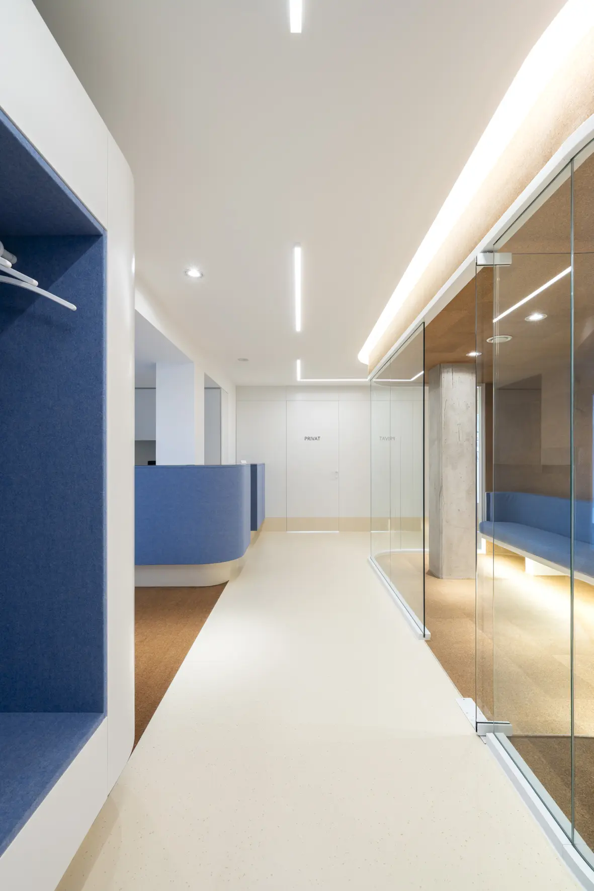 Die Zahnarztpraxis Zahnärzte am Goldbach verbindet innovative Behandlungen mit einem Design, das Wohlbefinden fördert. Der 180 m² große Raum ist um einen mit Kork verkleideten Kern organisiert, der Wartebereich und Nebenräume wie Röntgen, Toiletten und Umkleiden beherbergt. Natürliche Materialien wie Kork, Filz und Naturkautschuk schaffen eine ruhige, einladende Atmosphäre. Glaswände garantieren Privatsphäre an der Rezeption.