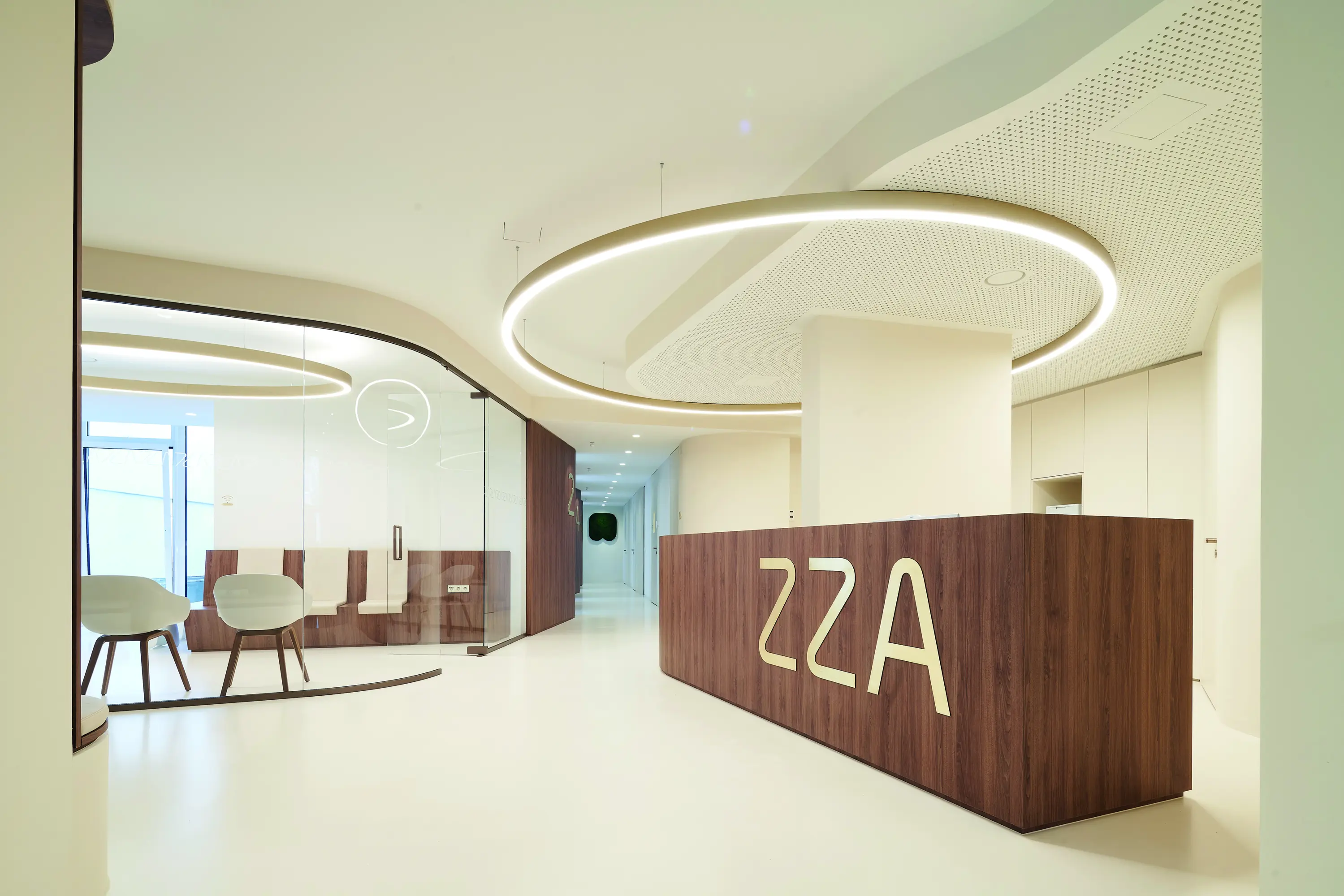 Bei dem Projekt ZZA handelt es sich um eine Zahnarztpraxis mit fünf Behandlungsräumen im Zentrum von Aachen, deren architektonisches Konzept das Wohlbefinden der Nutzer in den Fokus rückt. Durch klare Zonierung in Patienten-, Funktions- und Personalbereiche sowie einen zentralen Flur mit charakteristischer, gewellter Wand werden Orientierung und Privatsphäre geschaffen. Organische Formen, abgerundete Ecken und warmes Licht erzeugen eine einladende Atmosphäre. Hochwertiges Nussbaumdekor unterstreicht Wertigkeit und Komfort. Das Gestaltungskonzept verbindet Ästhetik, Funktionalität und emotionale Qualität zu einer positiven Praxiserfahrung.