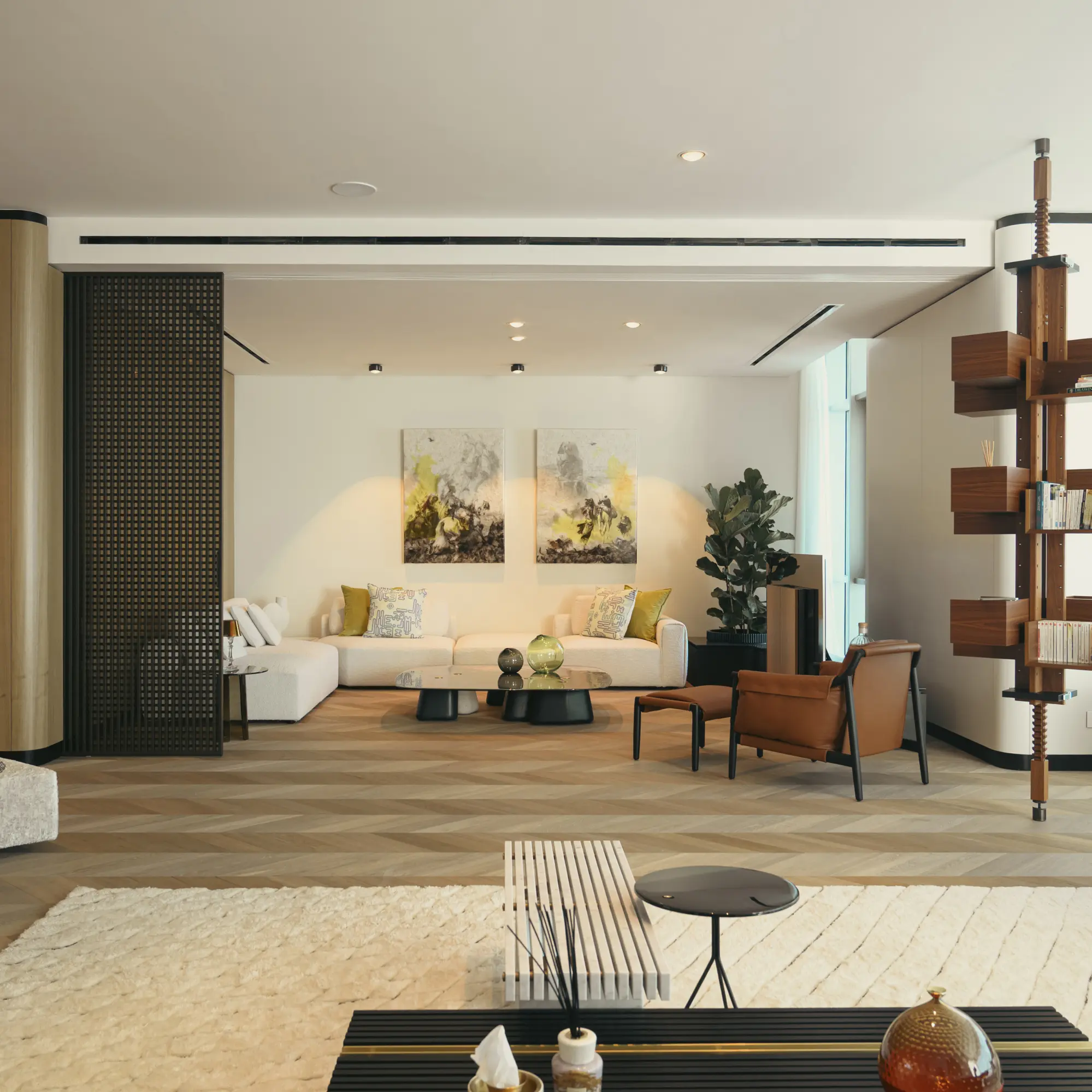 Eine elegante High-End-Wohnung im Zentrum von Beirut mit weitem Blick auf das Mittelmeer und die anmutig landenden Flugzeuge in der Ferne. Im Inneren trifft moderner Luxus auf zeitloses Design, mit hochwertigen Materialien, Designermöbeln und herausragenden Werken libanesischer Designer, die Tiefe und kulturellen Charakter verleihen. Ein maßgefertigtes, handgefertigtes Holzelement verbindet den offenen Raum, der sich vom Essbereich bis zum Empfangsbereich erstreckt, und sorgt für Wärme und Fluss. Darüber rahmt eine skulpturale Deckenkuppel einen auffälligen Pendelleuchter eines renommierten Designers ein und schafft einen subtilen Blickpunkt. Minimalistisch und doch reich an Details strahlt der Raum Charme und ein echtes Gefühl von Zuhause aus.