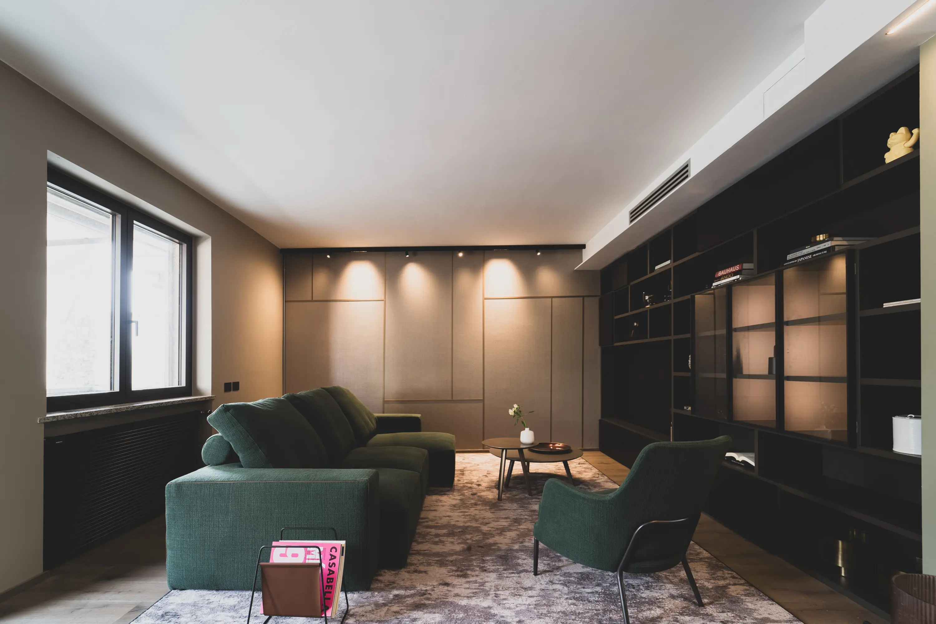Architekt Biondo realisierte die Komplettsanierung eines rund 200 m² großen Penthouses auf zwei Ebenen mit Terrassen in Novara. Die Wohnung spiegelte nicht den Stil der Eigentümer wider, die eine radikale Neuinterpretation wünschten. Nach dem Freilegen der Bausubstanz entwarf der Architekt neue, fließende Raumbeziehungen. Die Sanierung umfasste Böden, Wände und Raumgliederung sowie moderne Haustechnik mit Smart-Home-System und zentraler Klimatisierung. noLogo|architettura gestaltete jedes Detail – von Lichtkonzept bis zu versteckten Einbauten – zu einem eleganten, wohnlichen Gesamtbild.
