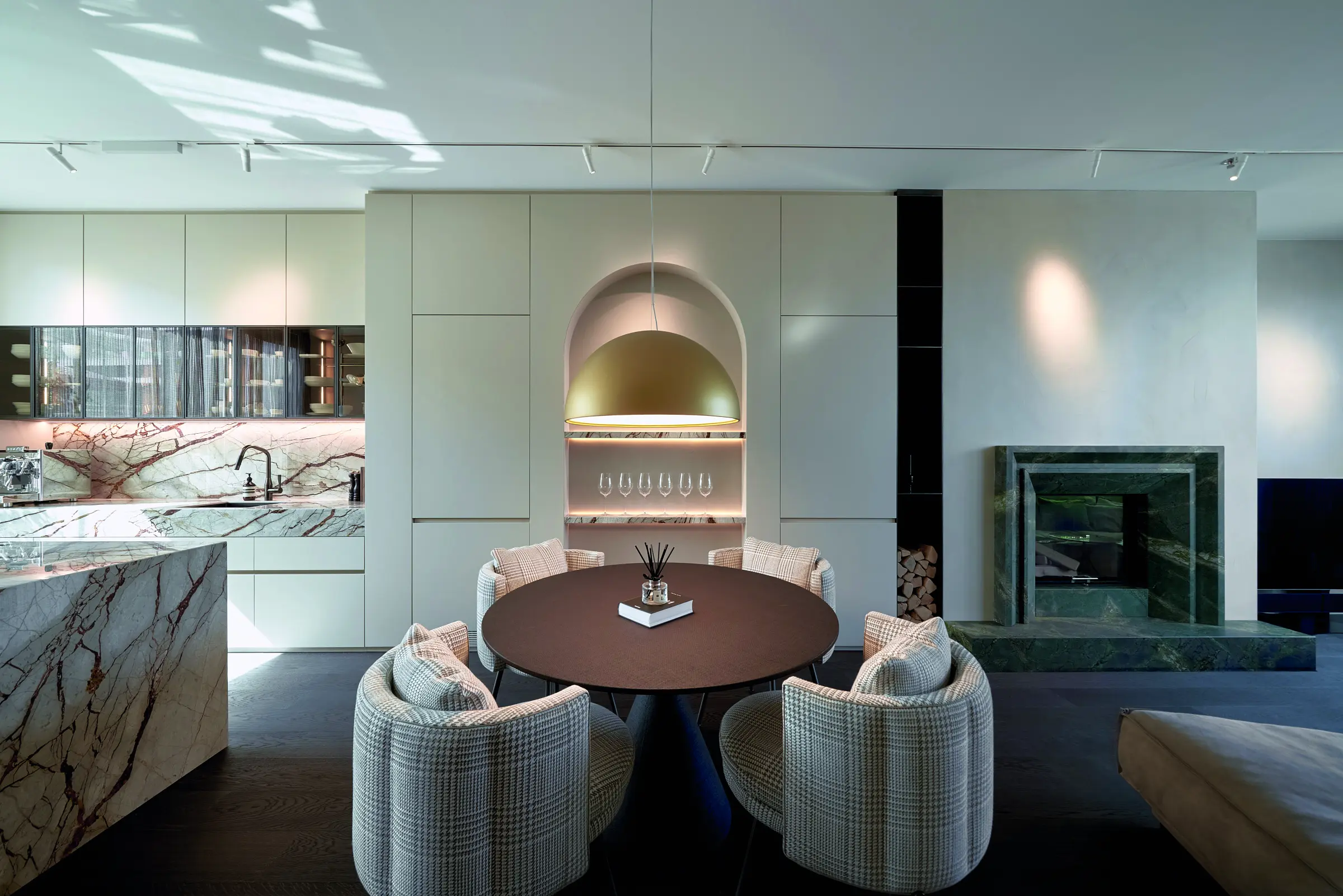 Dieses 165 m² Penthouse, gestaltet von Mezza—Maiso, präsentiert eine eklektische Mischung aus Eleganz und Schlichtheit. Mit Blick auf die Skyline von Wien verschmelzen kräftige Farben, seltene Materialien und kuratierte Sammlerstücke zu einem zusammenhängenden, sensorisch reichen Interieur. Großzügige üppig bepflanze Terrassen fungieren als lebendige Erweiterung des Wohnbereichs. Jedes Element – von den maßgefertigten Möbeln bis hin zu den strukturierten Oberflächen – spiegelt eine persönliche, kosmopolitische Ästhetik wider. Das Ergebnis ist eine nahtlose Verschmelzung von lebendiger Individualität und raffinierter architektonischer Vision.