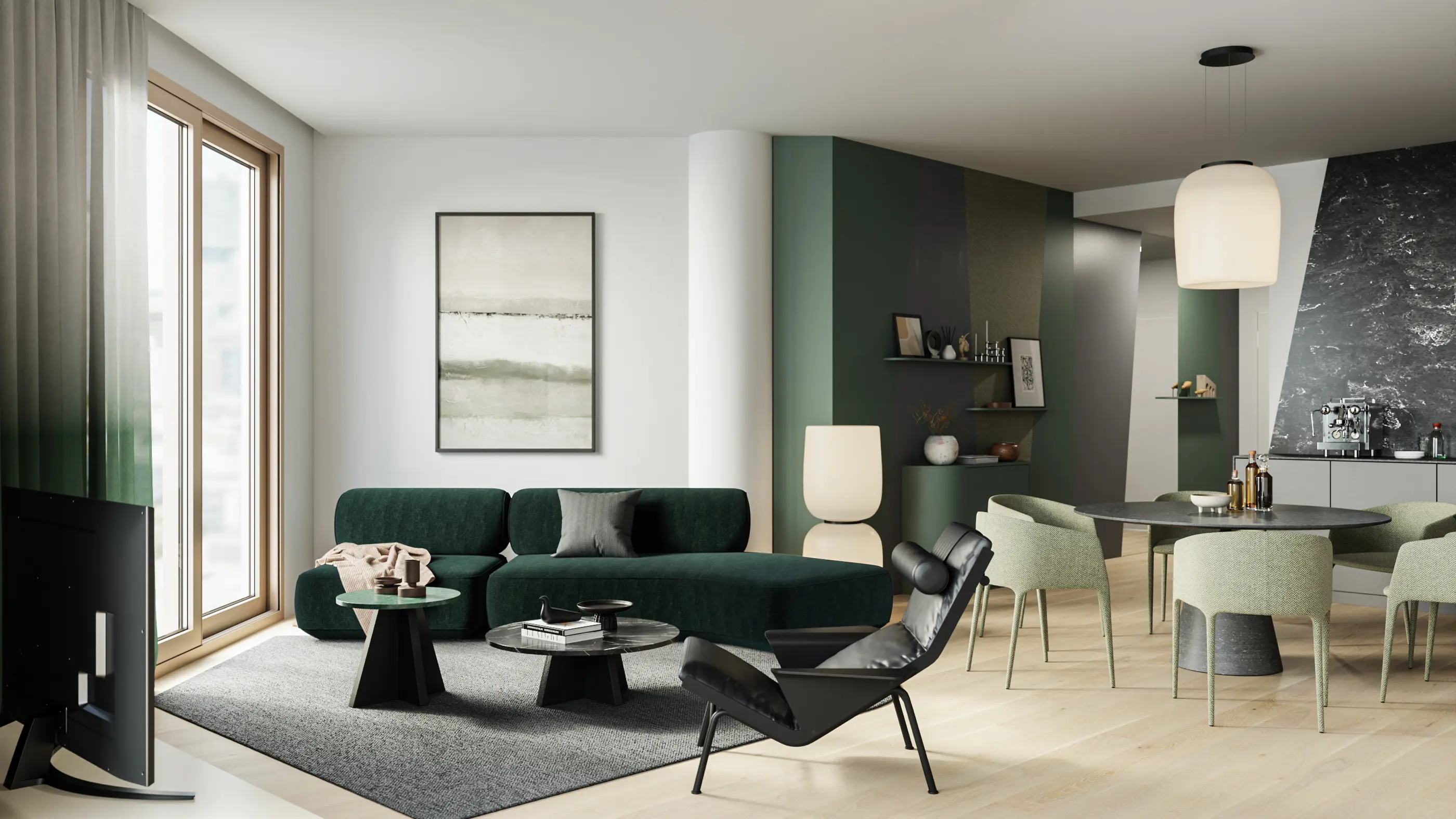 Moderne Eleganz und avantgardistische Klarheit verschmelzen in unserem Konzept für ein Apartment im FOUR Frankfurt zu urbaner Wohnkultur. Die einzigartige Formensprache des Gebäudes wurde bei der Gestaltung des Innenraums aufgegriffen und findet sich mit ihren Winkeln und Radien im Design der maßgeschneiderten Möbel wieder. Langlebige Materialien, kräftige Farben, nachhaltig gefertigte Produkte und lebendige Akzente bilden die Substanz der hochwertigen Einrichtung, die mit den Strömungen der umgebenden Stadtlandschaft interagiert. So entsteht ein Interieur, das einen bewussten, nachhaltigen Lebensentwurf kultiviert.