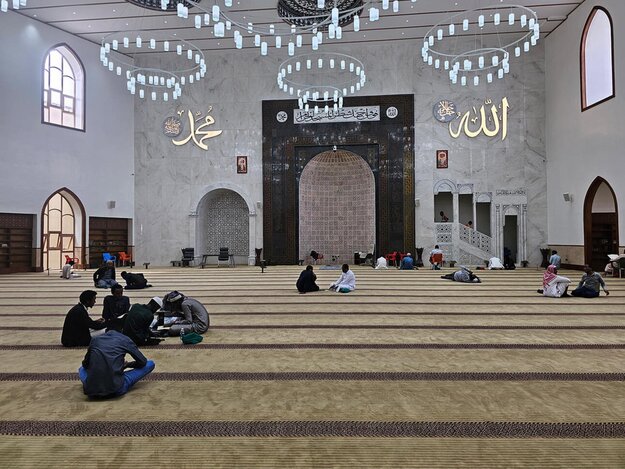 Die Innenarchitektur der »BBS Mosque« lässt die symbolischen und funktionalen Elemente der islamischen Religion auf hohem gestalterischen Niveau für alle Besucher*innen erlebbar werden. Dabei beeindruckt neben der Qibla-Wand mit der zentralen Gebetsnische auch die besonders kunstvolle Gestaltung der Decke, die durch acht um einen Hauptkreis angeordnete kleinere Kreise auf die acht verschiedenen Paradiestüren verweist.