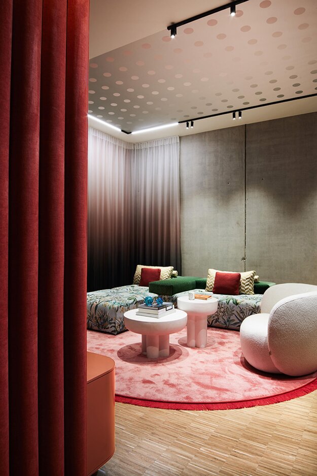 Das Business Apartment ist der Zweitwohnsitz einer Unternehmerin und bietet Gastfreundschaft und Rückzugsmöglichkeiten. Ursprünglich als Büro geplant, wurde die Einheit umgestaltet: Ein Badezimmer und ein Nebenraum wurden hinzugefügt; neue Öffnungen schaffen weite Blickachsen. Die raue Betonwand bildet einen bewussten Kontrast zur edlen Einrichtung. Das Farb- und Materialkonzept umfasst vielfältige Texturen und Farben, von weichen Polstern und Vorhängen bis zu speziell gefertigten Akustikelementen. Diese Wohnung spiegelt die zurückhaltende Extravaganz ihrer Besitzerin wider, einer erfolgreichen Unternehmerin in einer männerdominierten Branche.