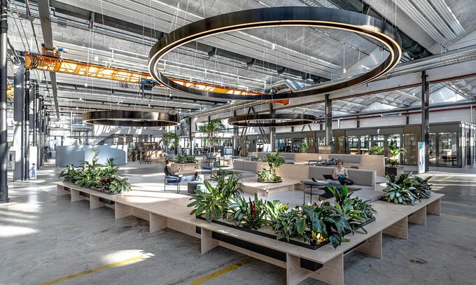 Umnutzen, Ressourcen schonen, Wert erhalten. Für die Dormakaba Group mit Hauptsitz in Rümlang bei Zürich stand das Gebäude der Zukunft schon. In der ehemaligen Produktionshalle ist eine innovative Arbeitswelt entstanden, die wie eine kleine Stadt funktioniert: Unterschiedliche Quartiere für unterschiedliche Arbeitsweisen laden zu stiller Fokusarbeit und kooperativem Teamwork ein. Ein Mix aus hartem Industrial-Stil und warmen, haptischen Materialien schafft Orte für Kreativität und Zonen zum Auftanken. Und das kommt gut an: Die Mitarbeitenden schätzen den inspirierenden Workspace – die Auslastung der Fläche ist deutlich gestiegen. Photo Credits: Arnold Weihs.