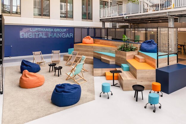 Der »Lufthansa Group Digital Hangar« überzeugt durch seine flexible Gestaltung, die sowohl ressourcenschonend als auch bedarfsgerecht ist und somit eine ideale Plattform für die moderne Arbeitswelt bietet. Wie dabei der zeitgemäße New-Work-Ansatz moderne und dynamische Designsprache mit der DNA des Luftfahrtunternehmens vereint, gelang auf hohem gestalterischen und funktionalen Niveau.