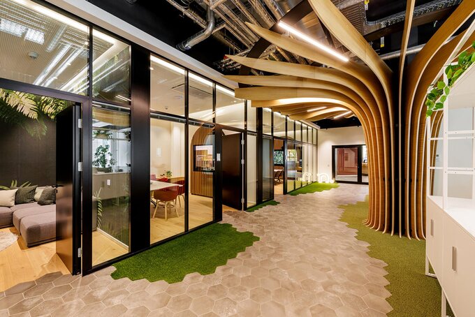 Das Office Interior Design für das »Natsana HQ« kombiniert geschickt Elemente und Farben aus der Natur mit moderner Formensprache und Technik. Das fördert nicht nur Kreativität und Wohlbefinden, sondern setzt auch nachhaltige Maßstäbe durch den Einsatz recycelbarer Materialien und energieeffiziente Lösungen. »Natsana HQ« verbindet Funktionalität mit einem inspirierenden Arbeitsumfeld.