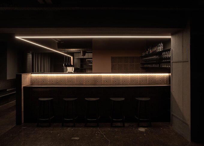 In der Tabakfabrik von Peter Behrens, 1925-39, wurde die Pizzeria 22k eröffnet. Destilat haben den 50 m2 großen Raum mit gegossenem Asphaltboden in tiefes Schwarz getaucht. Die verwendeten Holzelemente sind in der Tradition der japanischen Shou Sugi Ban Technik ausgeführt. Hauptelement des Raums ist die Bar aus roten Planziegeln: mit charakteristischer Wabenstruktur auf Sicht gestapelt, mit dunkler Fugenmasse ausgekleidet, geschliffen, mit Schwarzblech eingefasst und effektvoll hinterleuchtet.