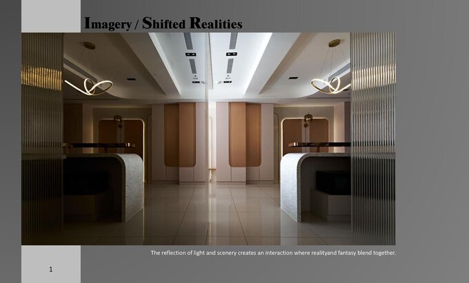 In einem ruhigen Raum mit gelbbraunem Glas und LED-Leuchten enthüllt sich das visuelle Erlebnis Schicht für Schicht, als würde sich eine Geschichte entfalten, während unbekannte räumliche Bereiche erkundet werden. Die Bilder werden gekonnt mit unterschiedlichen Tiefenschärfen gepaart, wodurch ein klarer und doch dynamischer Effekt entsteht. Die Reflexion von Licht und Landschaft erzeugt eine Interaktion, bei der Realität und Fantasie verschmelzen. Reflektierende Materialien werden verwendet, die metallische und transparente Merkmale mischen. Die Bewohner tauchen in ein Spektrum von Emotionen ein und erkunden den innovativen Lebensstilen.