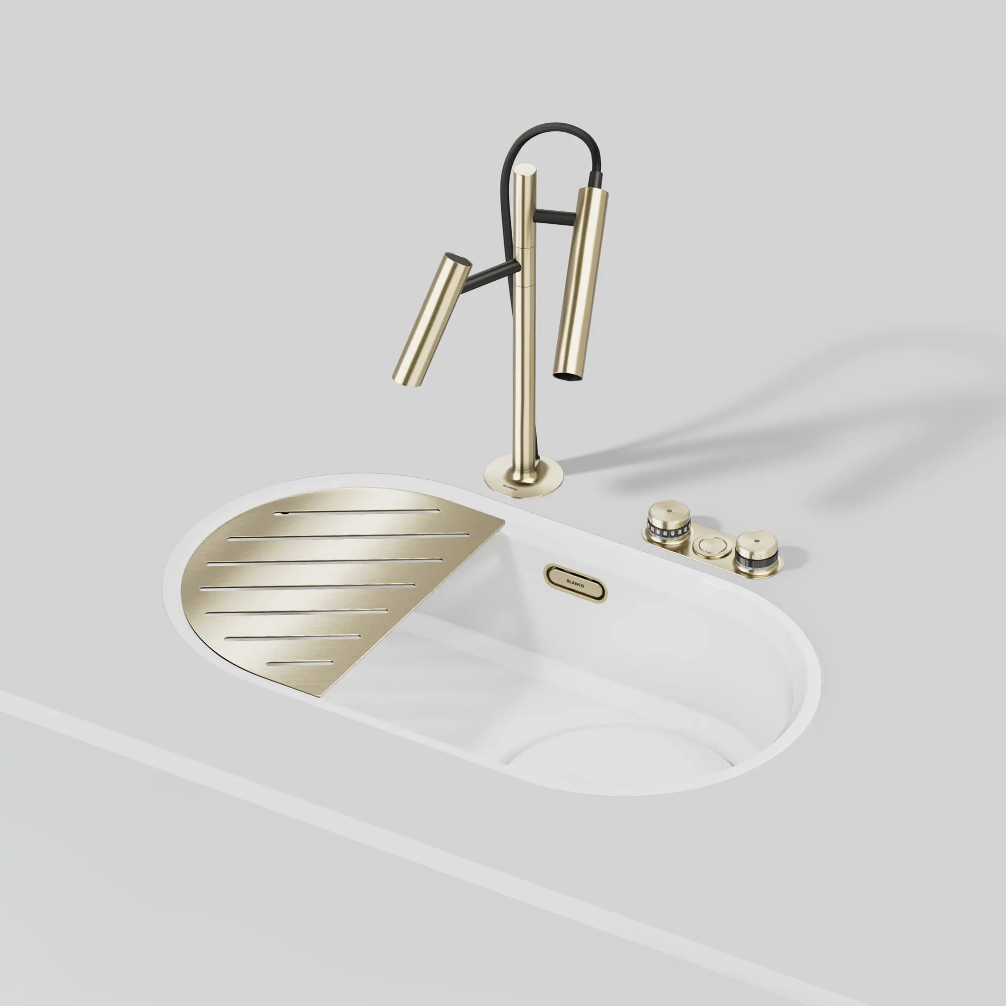 Eine Neuinterpretation des Wasserplatzes: Die lampenähnliche LUNEOO-S Armatur inszeniert Wasser wie Licht. Zwei Varianten: LUNEOO Uno liefert klassisches Warm-/Kaltwasser; LUNEOO Duo ergänzt gefiltertes, sprudelndes, gekühltes und kochend heißes Wasser, gesteuert über eine externe Bedieneinheit. Ihr magnetischer Dual-Sprühkopf bietet agile Reichweite. Dazu passt das ovale OOVALON-Becken aus samtigem VELGRANIT: weiche Wände, scharfe Fasen und ein schwebendes Metall-Grid schaffen eine zweite funktionale Ebene. Als BLANCO UNIT verschmelzen beide Produkte zu einer modularen Bühne für die Küche von morgen.
