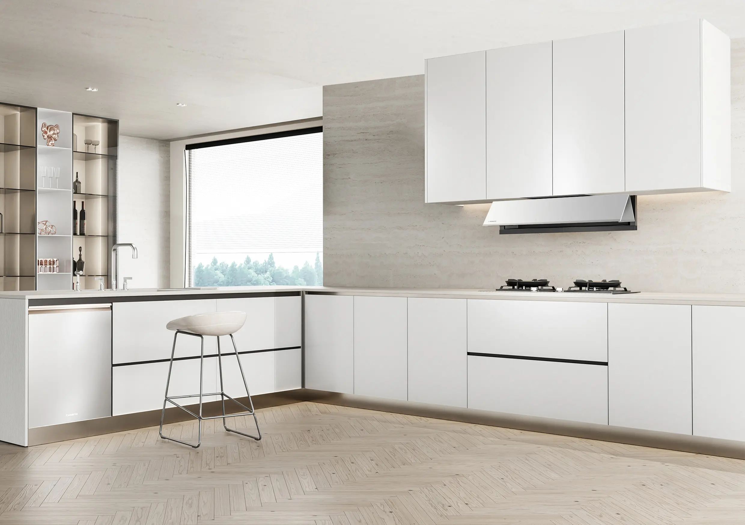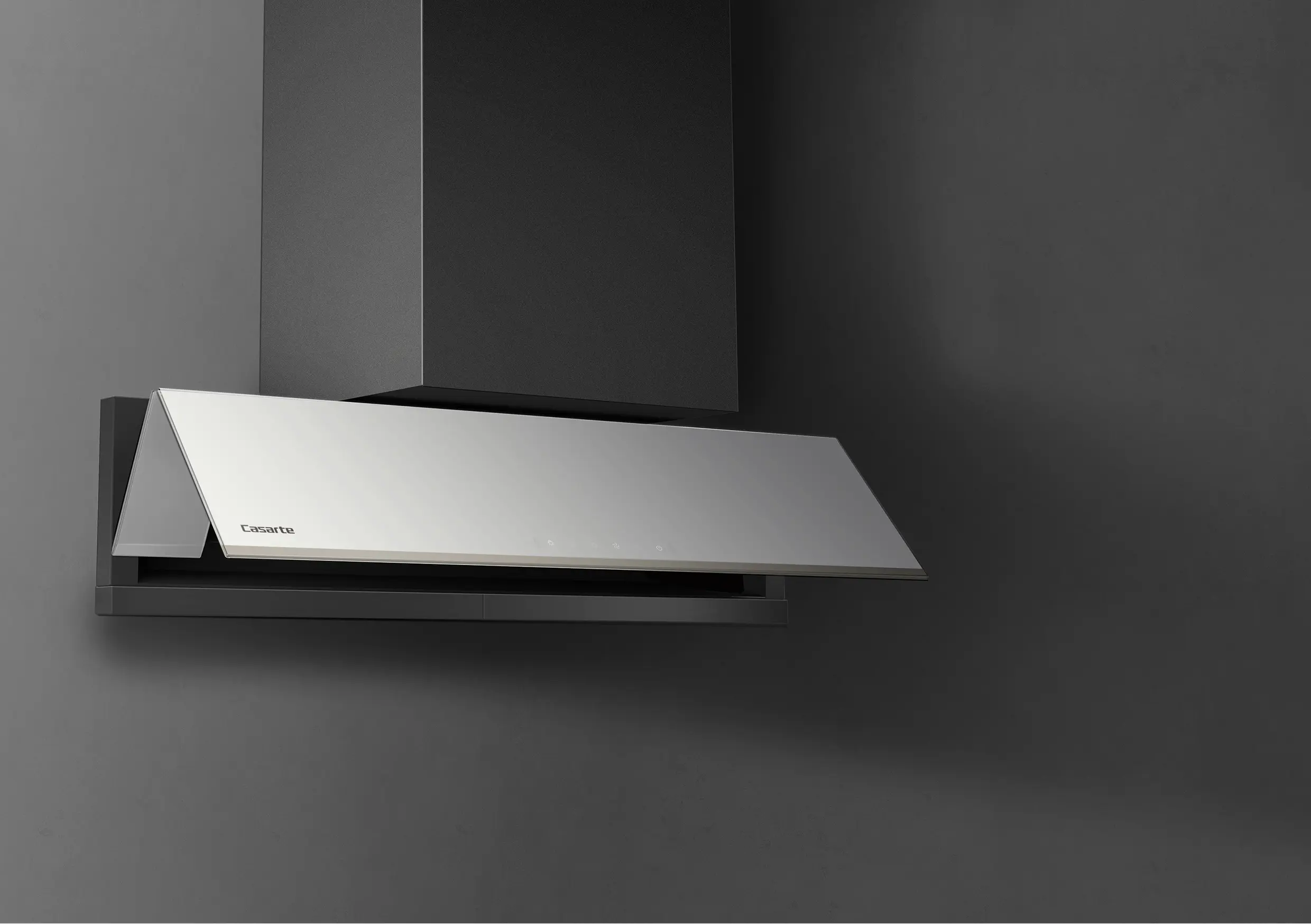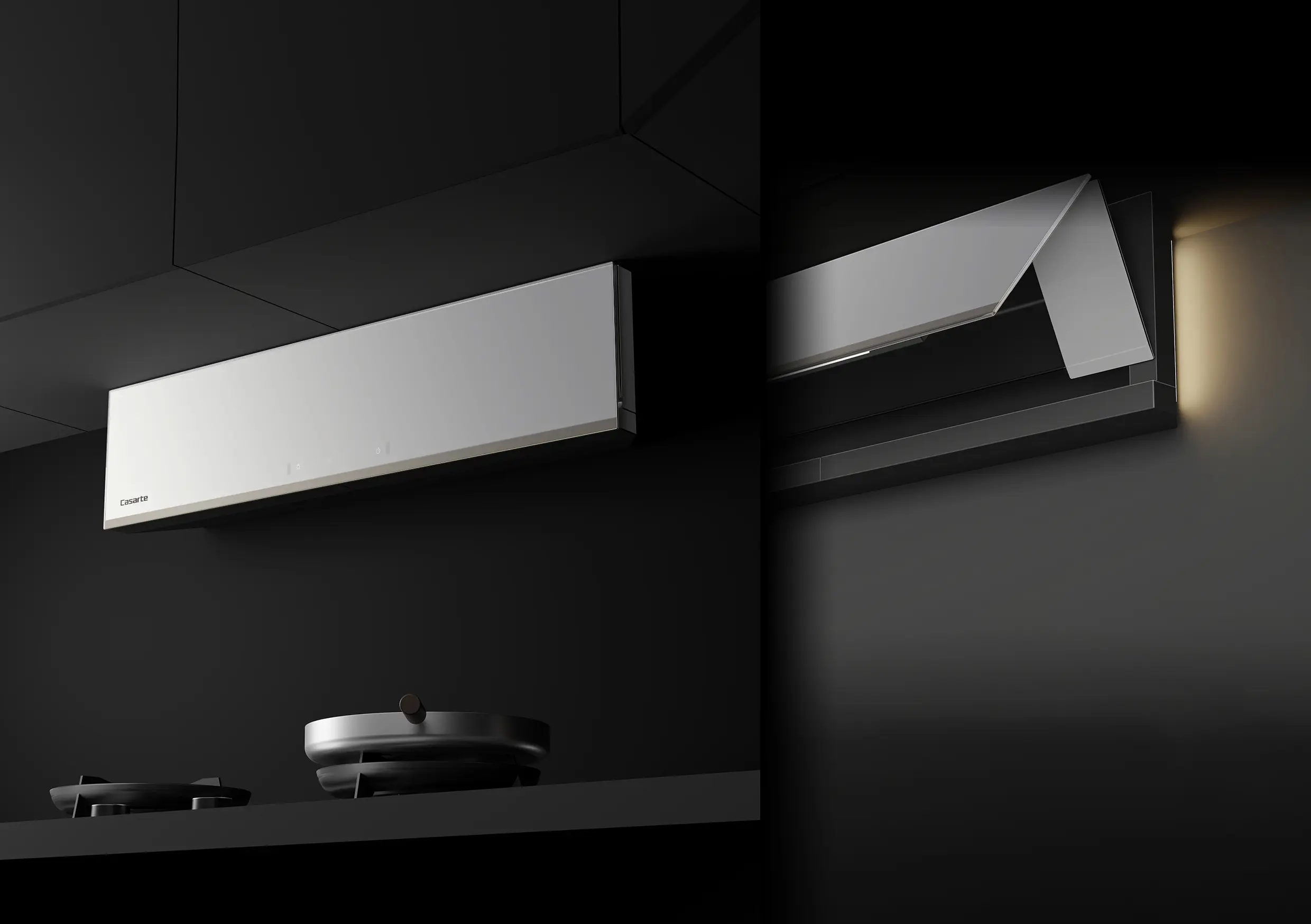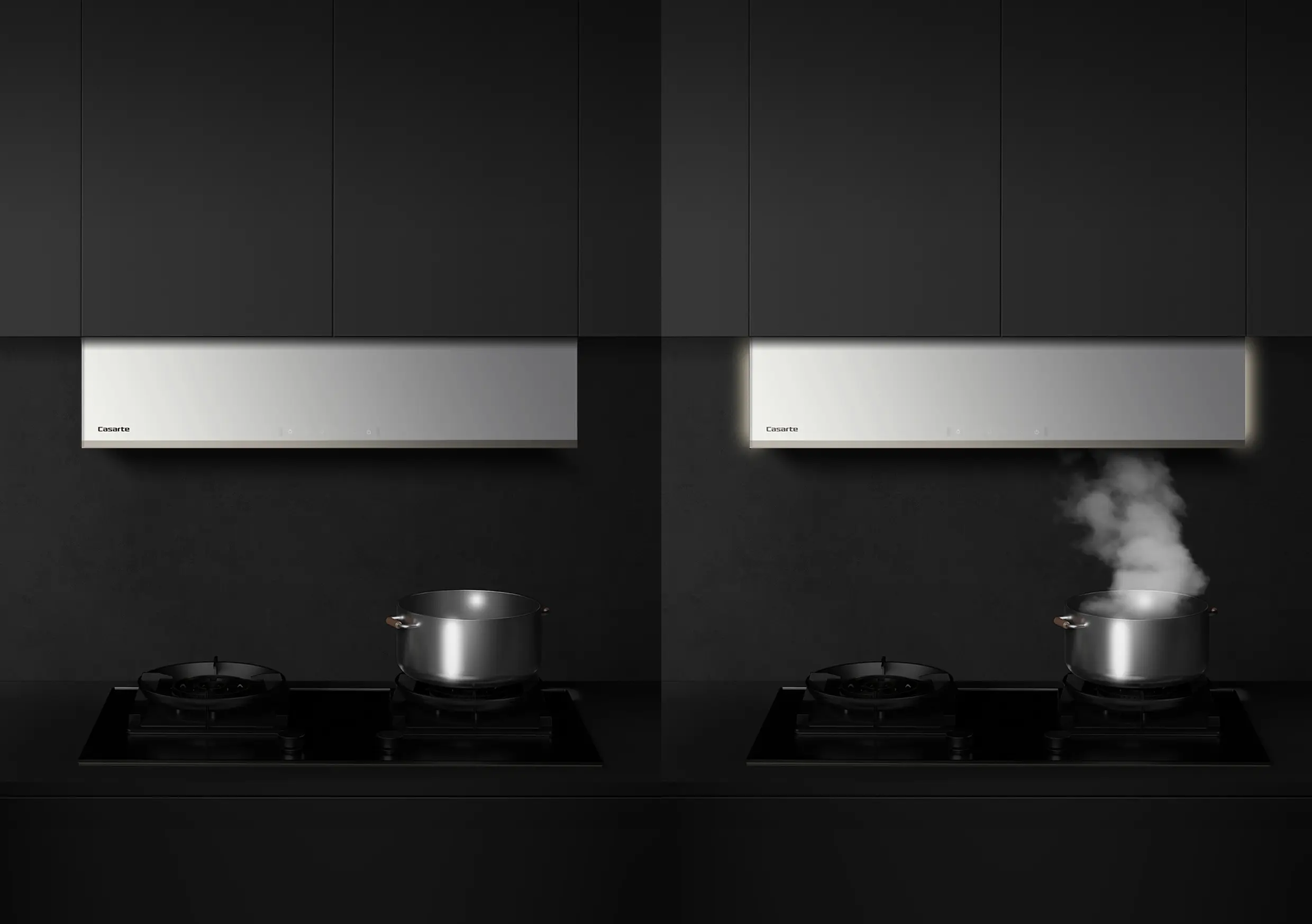 Das faltbare Dunstabzugsklappen-Design löst das Problem des Anhebens von Töpfen und der Sichtbehinderung. Mit einer Gehäusehöhe von nur 225 mm schafft es mehr Platz. Es passt sich während des Gebrauchs an 95 % der Körpergröße des Benutzers an, verhindert so Sichtbehinderungen und ist an Benutzer Körpergröße anpassbar. Die Metallverkleidung wurde entfernt und durch ein nahtloses Glasplatten-Design ersetzt, das leicht zu reinigen und umweltfreundlich ist. Ambientebeleuchtung auf beiden Seiten verbessert die räumliche Integration und schafft eine flächenbündig montierte Dunstabzugshaube, die auch für anspruchsvolle Benutzer geeignet ist.