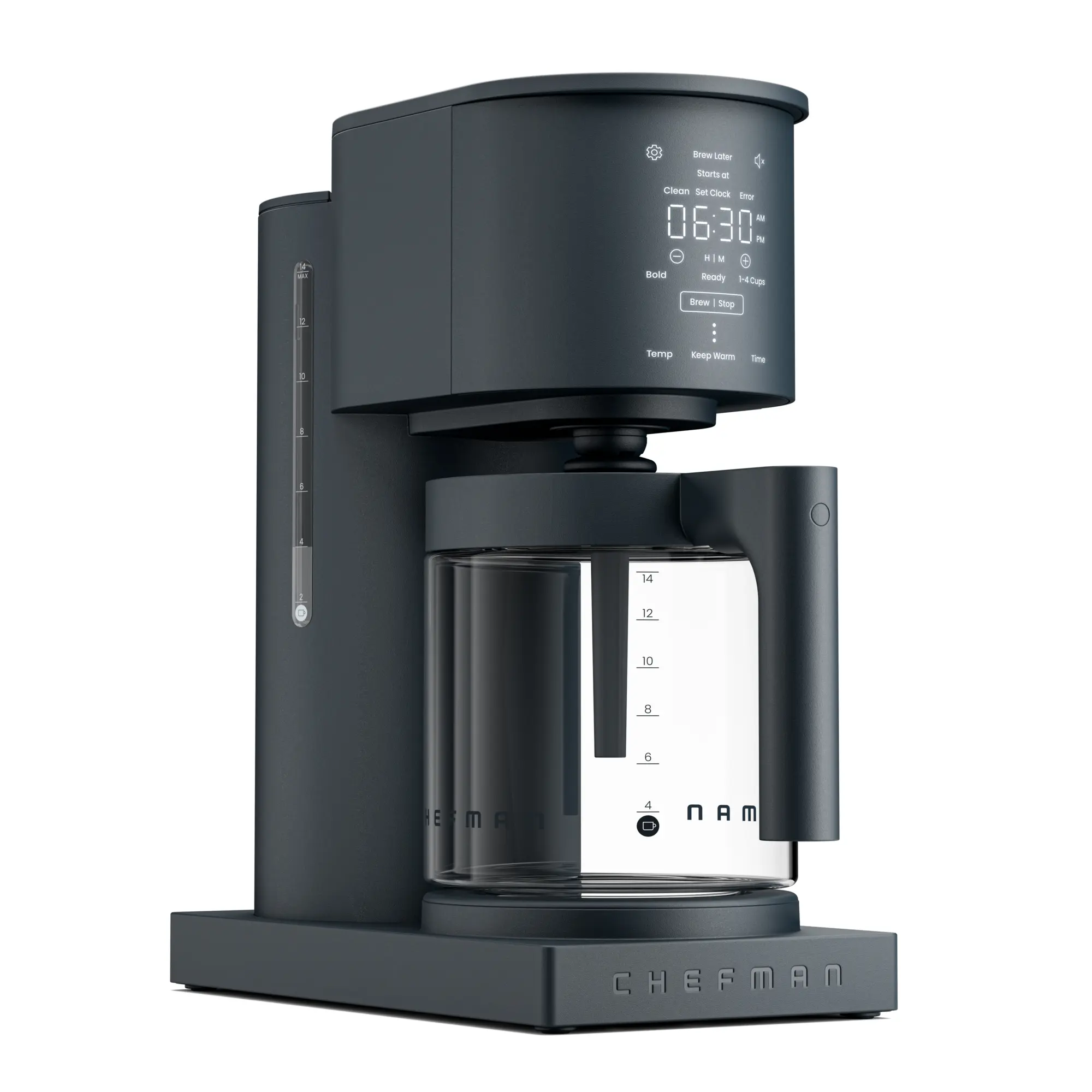 Der Chefman Caffeinator C14-DR14 ist eine Revolution im Bereich der Filterkaffeemaschinen. Mit einer 14-Tassen-Kanne, einem BalancedBrew™-Trichter und einem Blütezyklus liefert er vom ersten bis zum letzten Schluck einen reichhaltigen, gleichmäßigen Geschmack. Brühen Sie starken oder klassischen Kaffee, eine einzelne Tasse oder eine ganze Kanne, und wachen Sie mit frischem Kaffee dank der programmierbaren 24-Stunden-Zeitschaltuhr auf. Die individuell einstellbare Warmhalteplatte hält den Kaffee stundenlang auf Ihrer bevorzugten Temperatur warm. Mit einem wiederverwendbaren GoldTone®-Filter und einem extrabreiten Duschkopf definiert diese Maschine das Filterkaffee-Brühen neu – intelligent, leistungsstark und auf überragende Leistung ausgelegt.