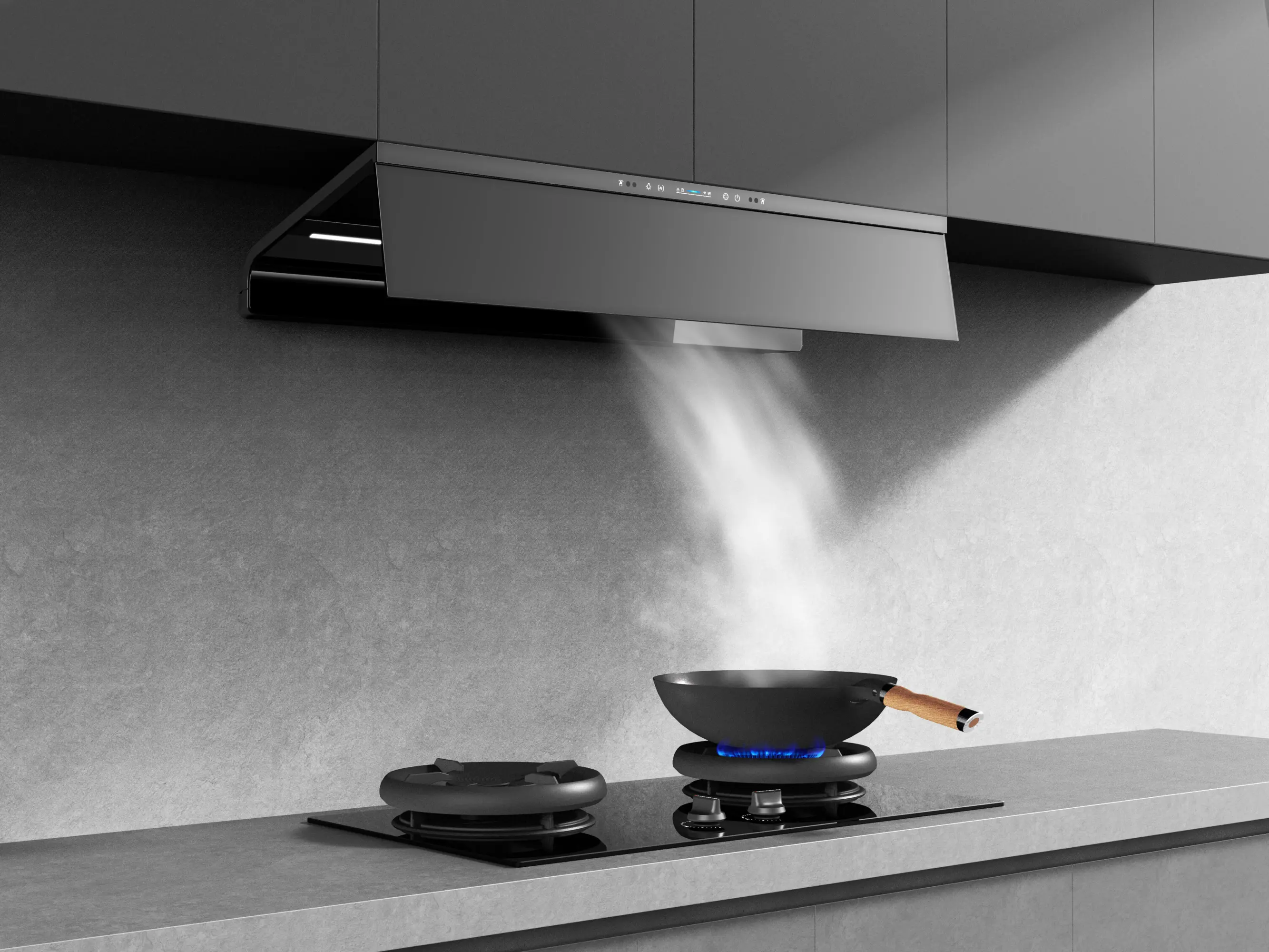 Die CURTAIN-M3 Ultra-Slim ist eine Dunstabzugshaube der nächsten Generation für die chinesische Küche. Ihr ultradünnes Gehäuse schafft Platz und ein offenes Kochumfeld. Das Gerät schließt bündig mit den Schränken ab, um Kopfstöße zu vermeiden. Der klappenförmige Ansaugstutzen bildet eine Barriere und trennt die Atem Zone von Kochdämpfen und Hitze. Dank des gewölbten Glases bietet die Haube im ausgeschalteten Zustand eine nahtlose Oberfläche, die Fettablagerungen minimiert und die Reinigung erleichtert. Ein versteckter Ölbehälter reduziert den Wartungsaufwand. Im Inneren reduziert die fettabscheidende Flügeltechnologie die Luftverschmutzung.