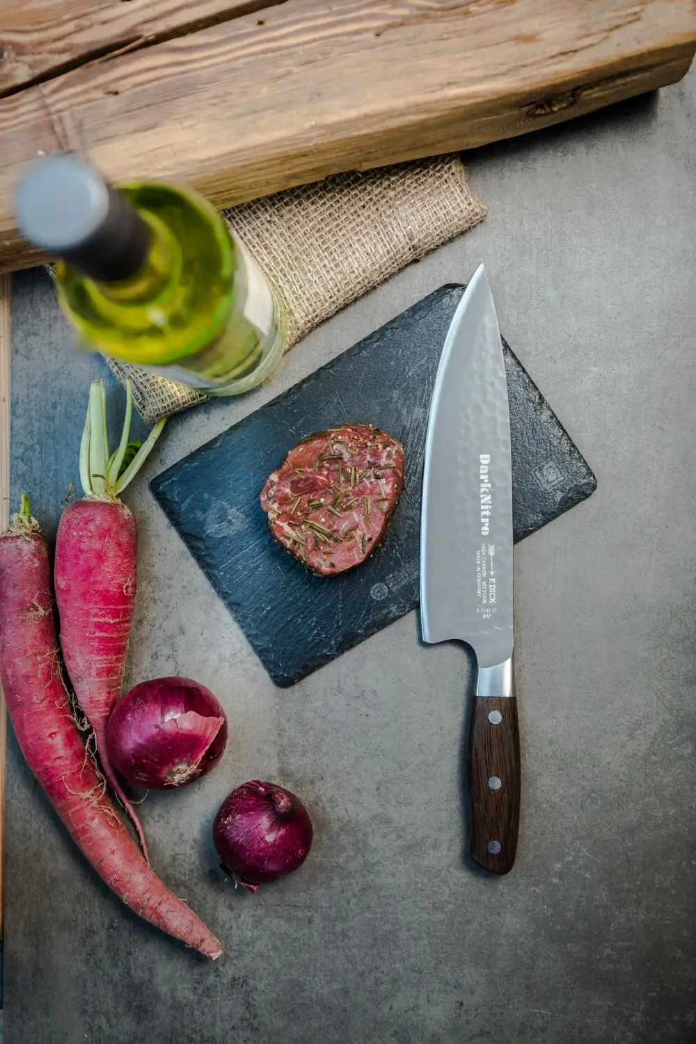 Einmalige Messerkunst – pures Industrie-Design. Die geschmiedete Serie DarkNitro ist ultimative Messerkunst. Das Zusammenspiel zwischen der einzigartigen Klingenoptik mit Hammerschlag-Prägung und dem besonderen Eichenholzgriff zeichnet diese Unikate aus. Die schwungvolle und klare Linie des Griffes verstärkt die elegante Formensprache des Messers. Die anthrazitfarbene Klinge wird durch ein spezielles und umweltschonendes Verfahren eingefärbt. So entfalten die Messer ihre pure Industrie-Schönheit. Für die extreme Schärfe werden die Klingen zusätzlich eisgehärtet.