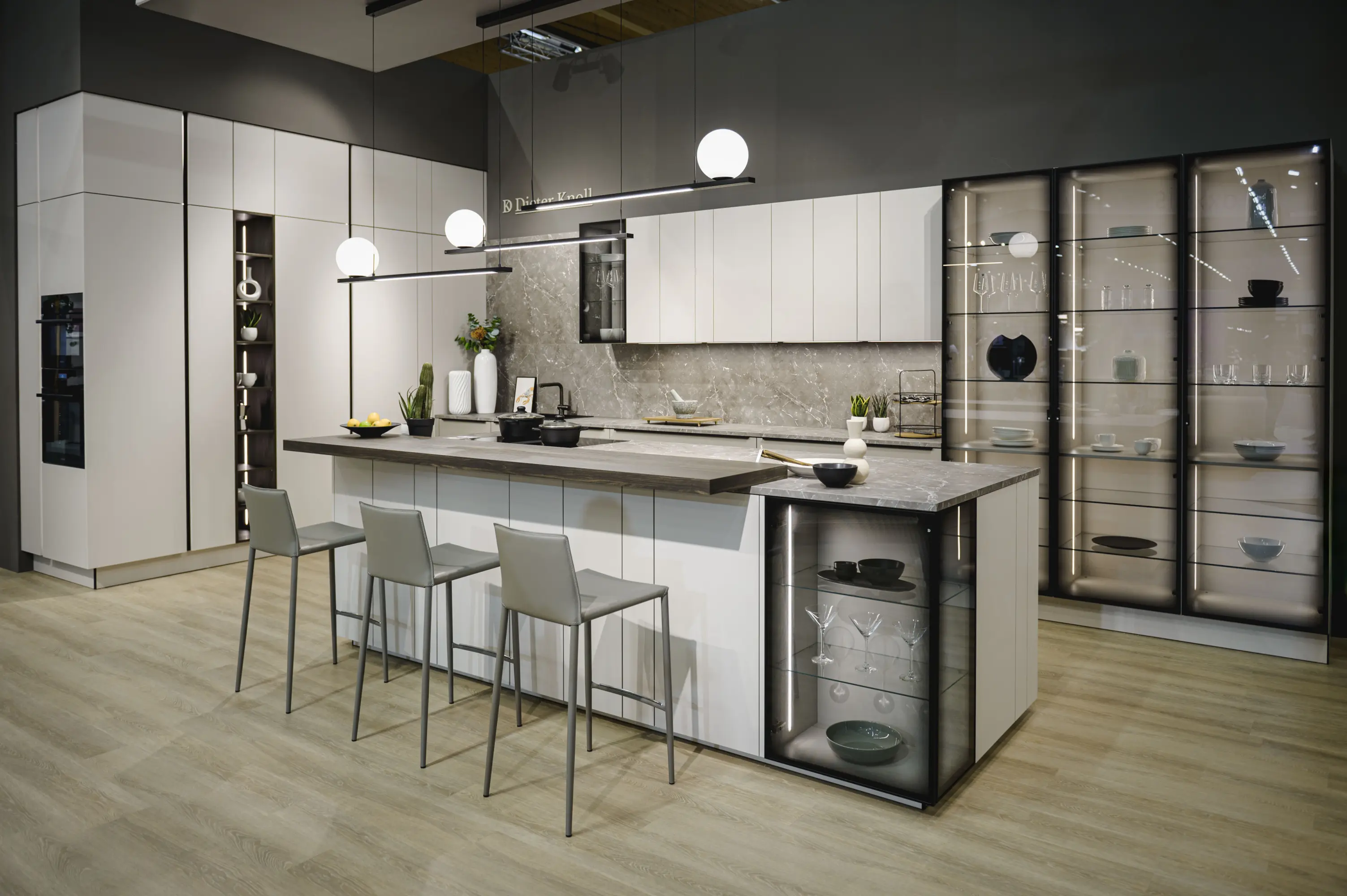 Die Dieter Knoll Küche verbindet Küche, Ess- und Wohnbereich zu einem harmonischen Lebensraum. Der Raum öffnet sich durch eine reduzierte Glaseckvitrine, die mit einem speziell entwickelten, elegant verlaufenden Keramiksiebdruck zum architektonischen Blickfang wird und Wohnlichkeit in die Küche bringt. Maßgeschneiderte Planung für jeden Raum trifft auf eine innovative Korpus Bauhöhe von 80cm und auf Wunsch extra hohe Hochschränke. Soft-Close-System, Anti-Fingerprint-Oberflächen und vertikal geführtes, blendfreies LED-Licht bieten höchsten Komfort. Lichtfarbe und Helligkeit sind individuell steuerbar. Qualität - made in Germany.