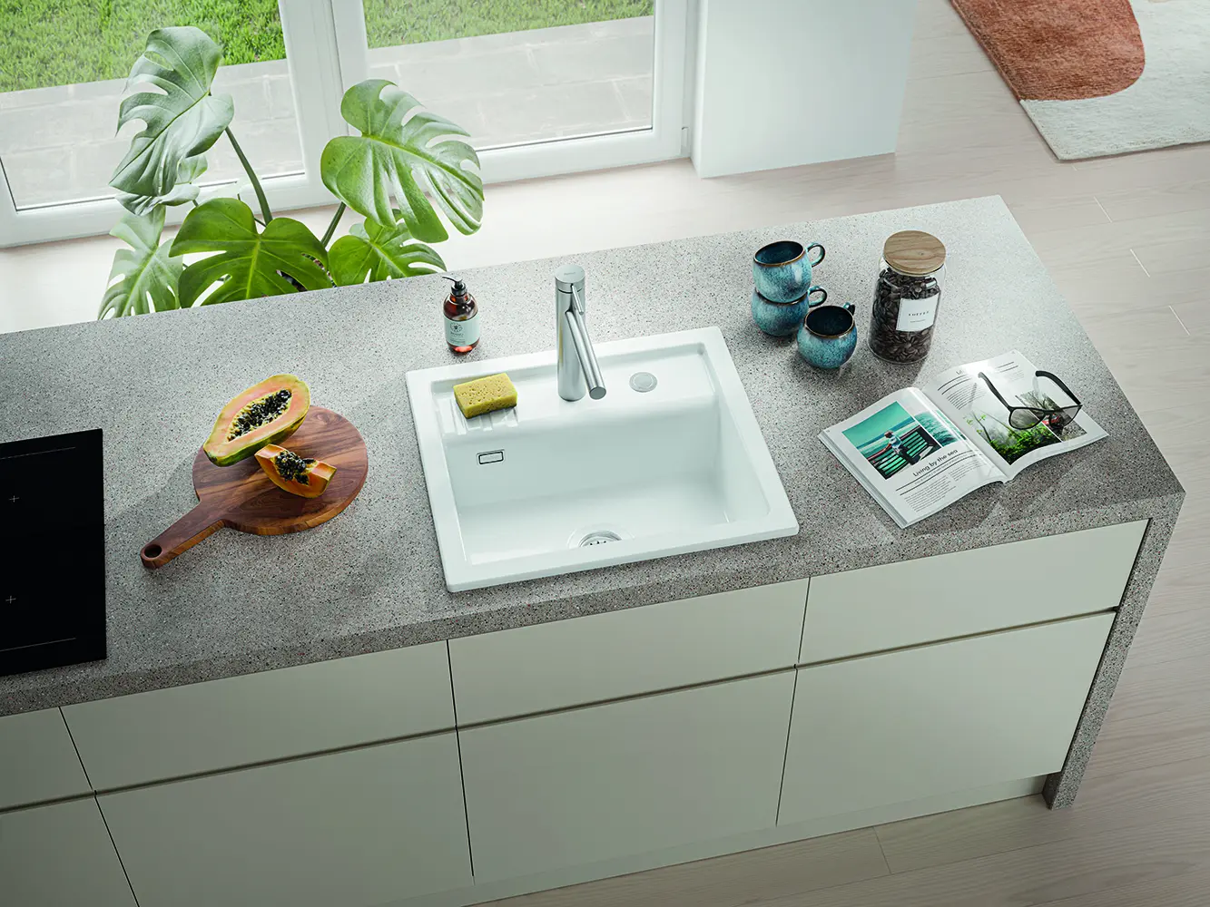 Spüle pur. Klar, fließend, raffiniert! Die Einbauspüle SILQUA ist raffiniert konzipiert. Weiche, von fließendem Wasser inspirierte Radien verringern die Putzarbeit und Gefahr von Schlagschäden. Die Armatur ist auf eine in die Spüle integrierte Armaturenbank gesetzt. So bleiben die Hände zum Bedienen innen, Wasser kann in die Spüle tropfen und muss nicht draußen abgewischt werden. Gläser oder Tassen trocknen auf den eingeprägten Ablaufrillen der Armaturenbank. In Zusammenarbeit mit Hans Winkler Design, Grafenau, entwickelt. SILQUA passt überall: mit drei Materialien (Keramik, Composite, Edelstahl) u. mehreren Farbvarianten und Einbauarten!