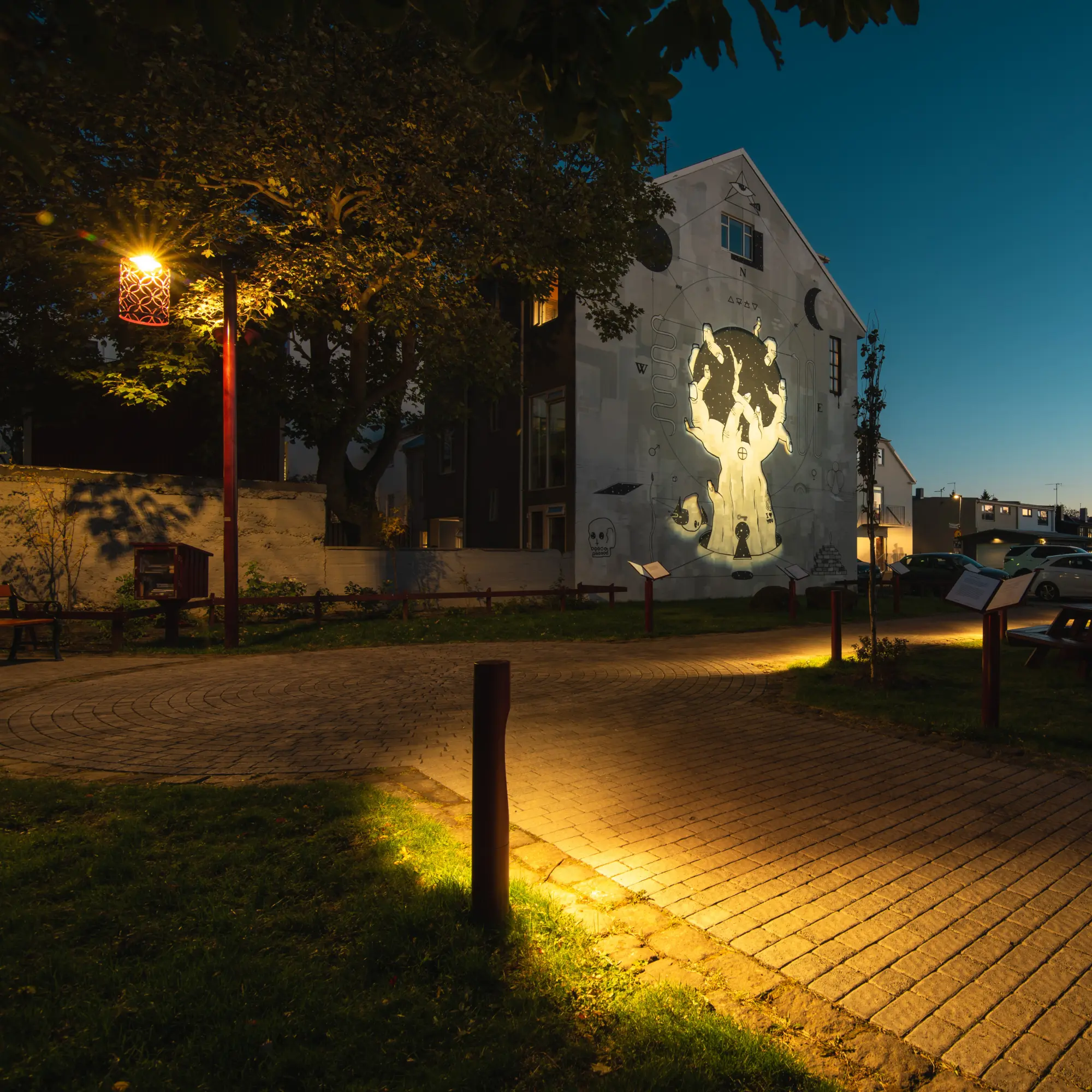 Freyjugardur ist ein öffentlicher Garten, der den Stimmen isländischer Lyrikerinnen gewidmet ist. Leuchtpoller entlang eines Weges führen Besucher durch die Anlage und schaffen somit eine ruhige Atmosphäre. Die Beleuchtung mit 2700K sorgt für eine sanfte Stimmung. Eine dekorative Laterne trägt zur behaglichen Atmosphäre bei, während RGBW-Leuchten das Blätterdach darüber farblich akzentuieren und bei besonderen Anlässen ihre Farben wechseln. Ein Wandgemälde mit dem Titel Yggdrasil entfaltet bei Einbruch der Dämmerung seine besondere Wirkung, wenn ein Gobo-Projektor das Kunstwerk in Szene setzt und die Aufmerksamkeit der Passanten auf sich zieht.