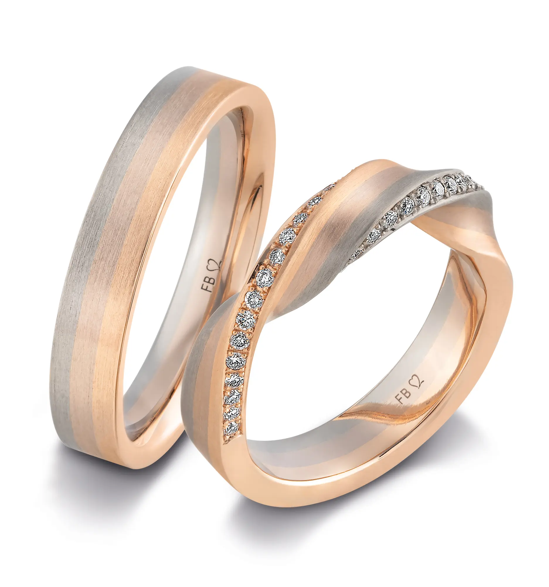 Das Trauringpaar "Blended Wave" vereint eine präzise Fasstechnik mit einer hohen Goldschmiedekunst. 37 lupenreine Brillanten folgen der von Hand gedrehten Ringschiene aus 14 Karat Gold und scheinen den Damenring zu umschlingen. Den durchlegierten Ring bedeckt eine Strichmatt-längs von Hand gefertigte Oberflächenstruktur. Das Besondere: Die Legierungen Blushgold, Rotgold und Weißgold werden durch ein Wellendesign miteinander verbunden, dadurch scheinen die Ringe einen Farbverlauf zu besitzen.