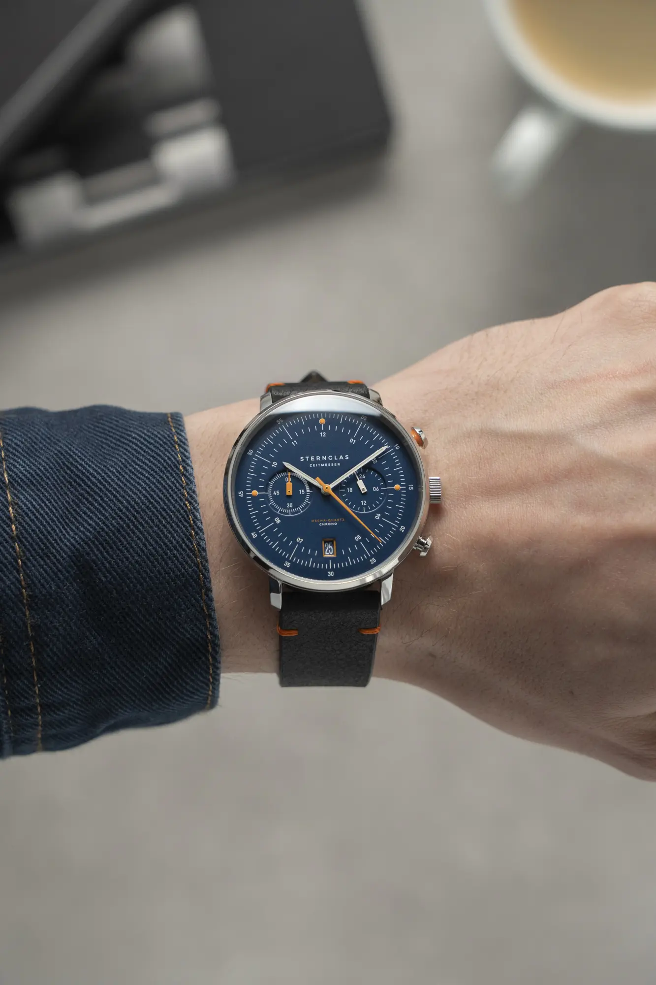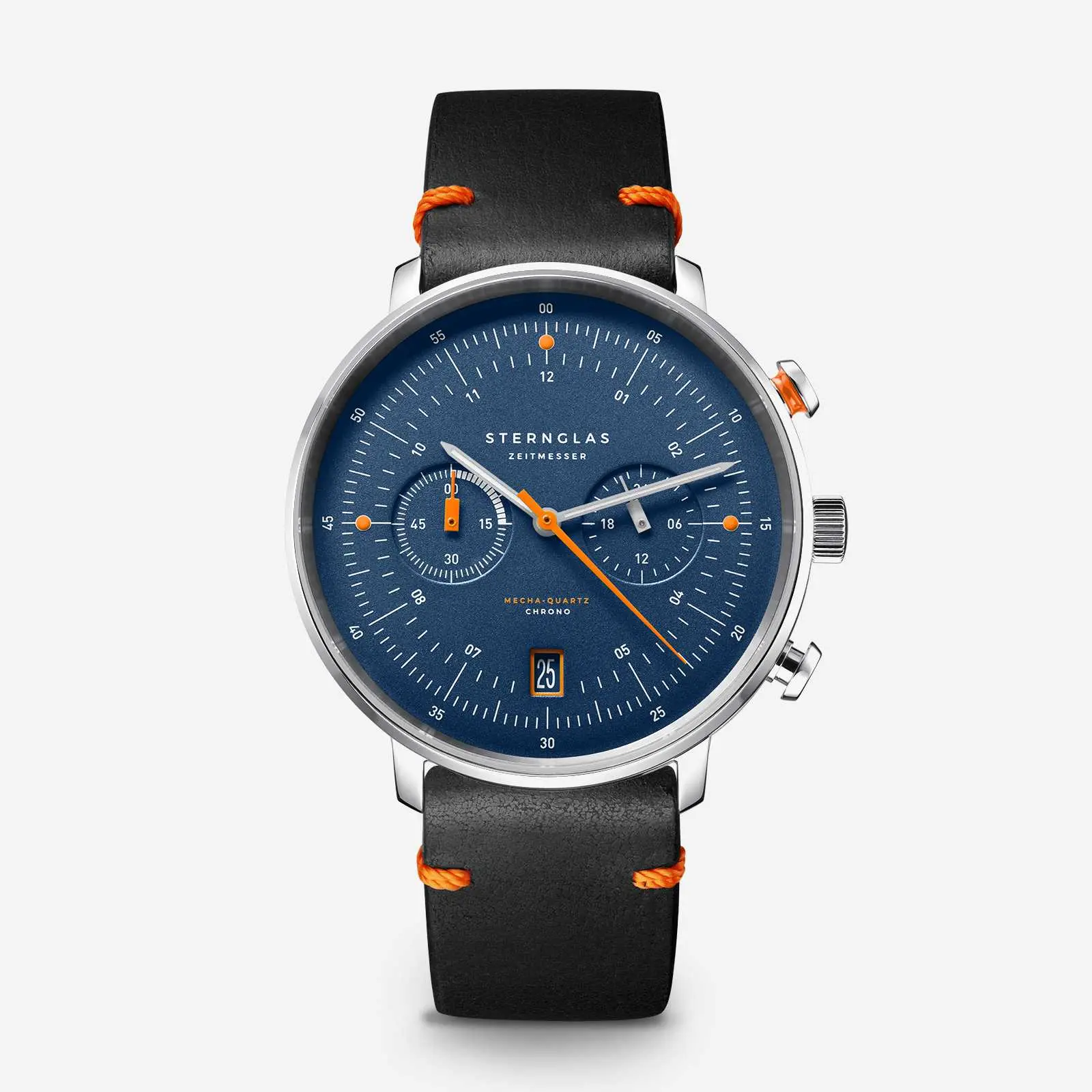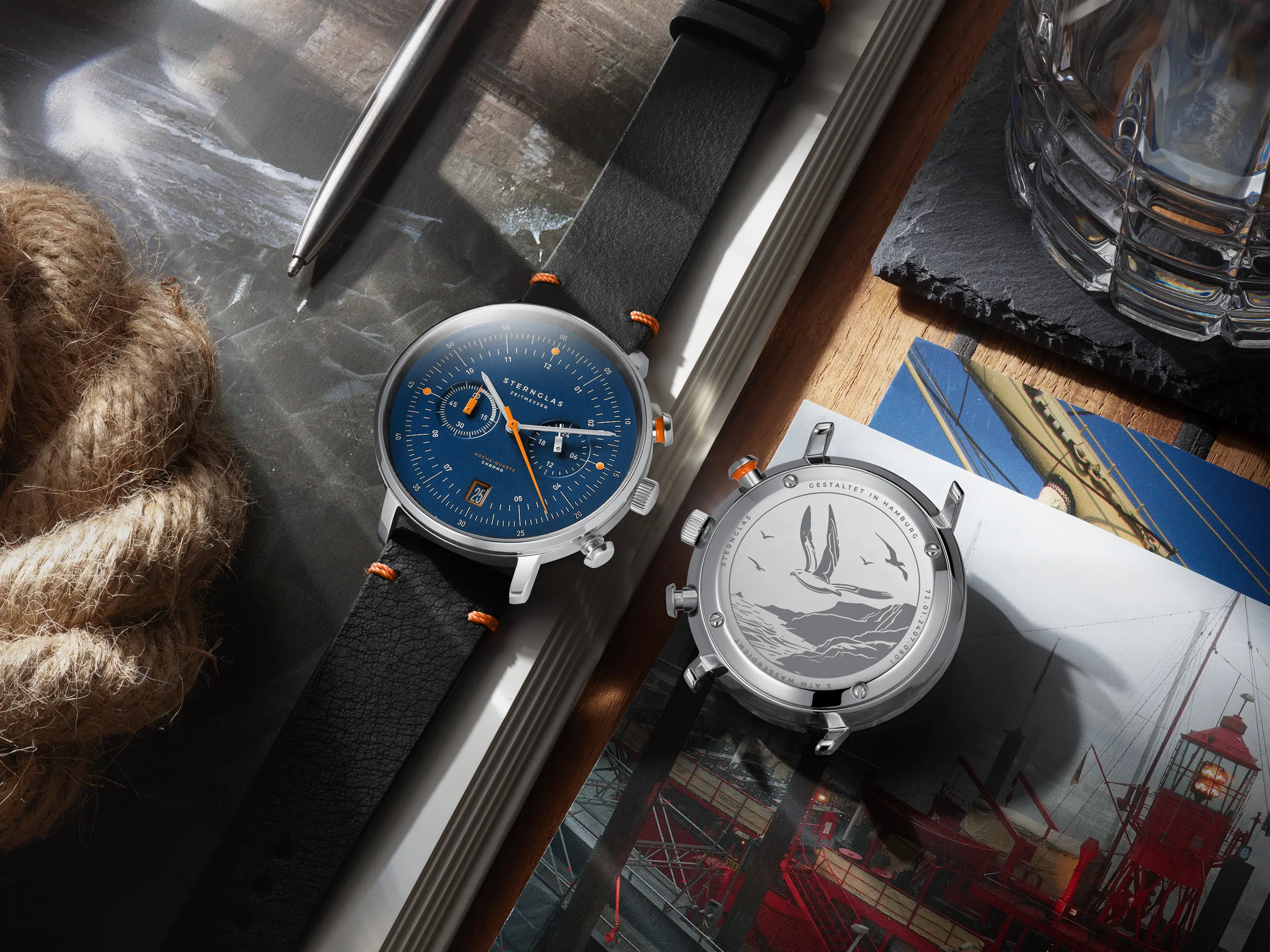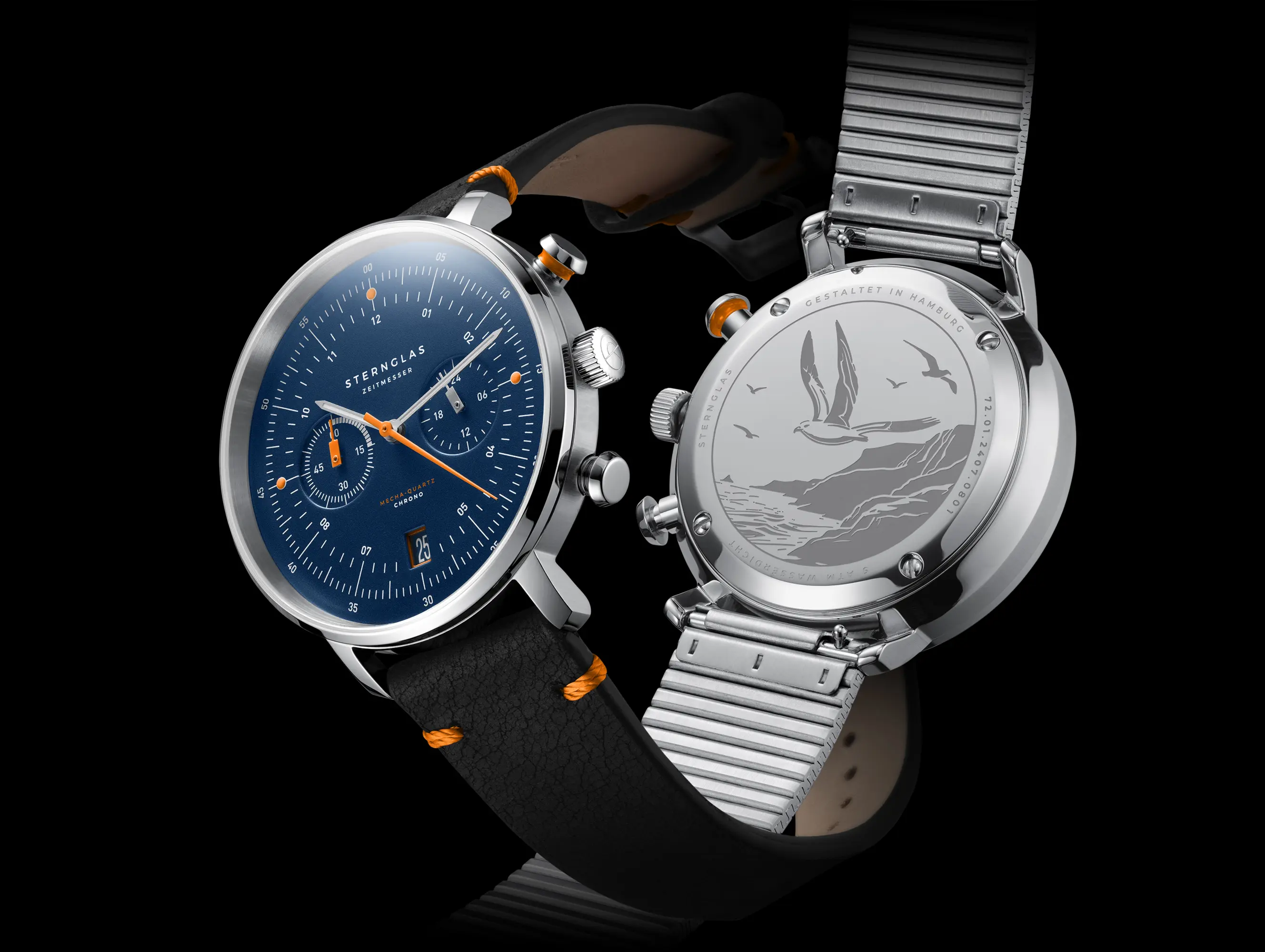 Hamburg Chrono Edition Küste verbindet maritimen Charme mit zeitloser Eleganz. Tiefblaues Zifferblatt, polierter und gebürsteter Edelstahl sowie orangefarbene Akzente schaffen eine harmonische Balance aus Raffinesse und Sportlichkeit. Die Gravur des Eissturmvogels auf der Rückseite symbolisiert Freiheit und Ausdauer. Angetrieben vom präzisen Mecha-Quartz VK64 von Seiko vereint der Chronograph fließende Zeigerbewegung, Bauhaus-inspirierte Gestaltung und robuste Materialien zu einem langlebigen Begleiter.