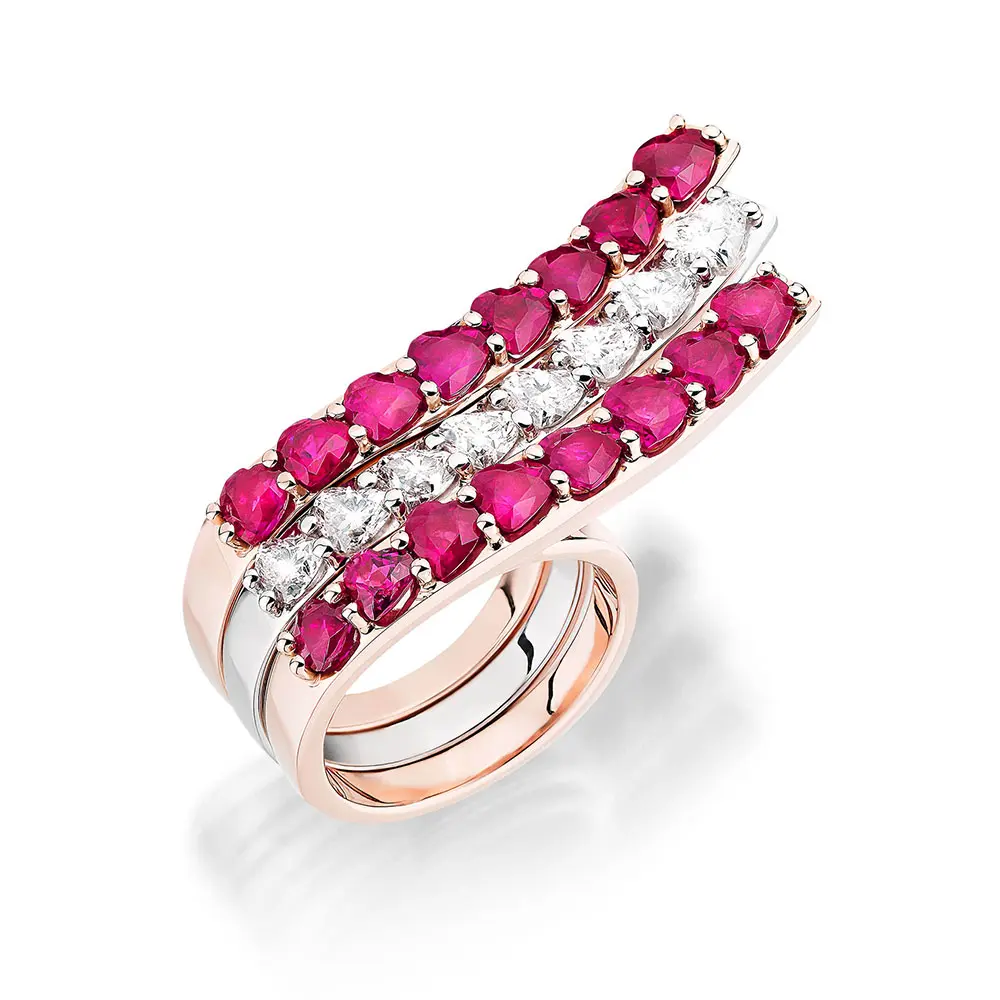 Mit dem Ring TOGETHER setzt der österreichische Juwelier Schullin ein funkelndes Zeichen für Zusammenhalt, Friede und Liebe mit den wertvollsten Edelsteinen unserer Erde: mit Burma-Rubinen (5,21 ct), Diamanten (1,65 ct, die dem Kimberley-Prozess unterliegen) und 18 Karat Fairtrade-Gold. Zusammen (TOGETHER) getragen, zeigt der Ring die Farben Österreichs; zufliegende Herzen transportieren Emotionen in der Wellenbewegung des Walzertakts über Grenzen hinweg. Drei Ringe - zusammen mehr als ihre Einzelteile - erinnern daran, dass wahre Stärke im Miteinander liegt und dass durch Zusammenhalt Außergewöhnliches entstehen kann.