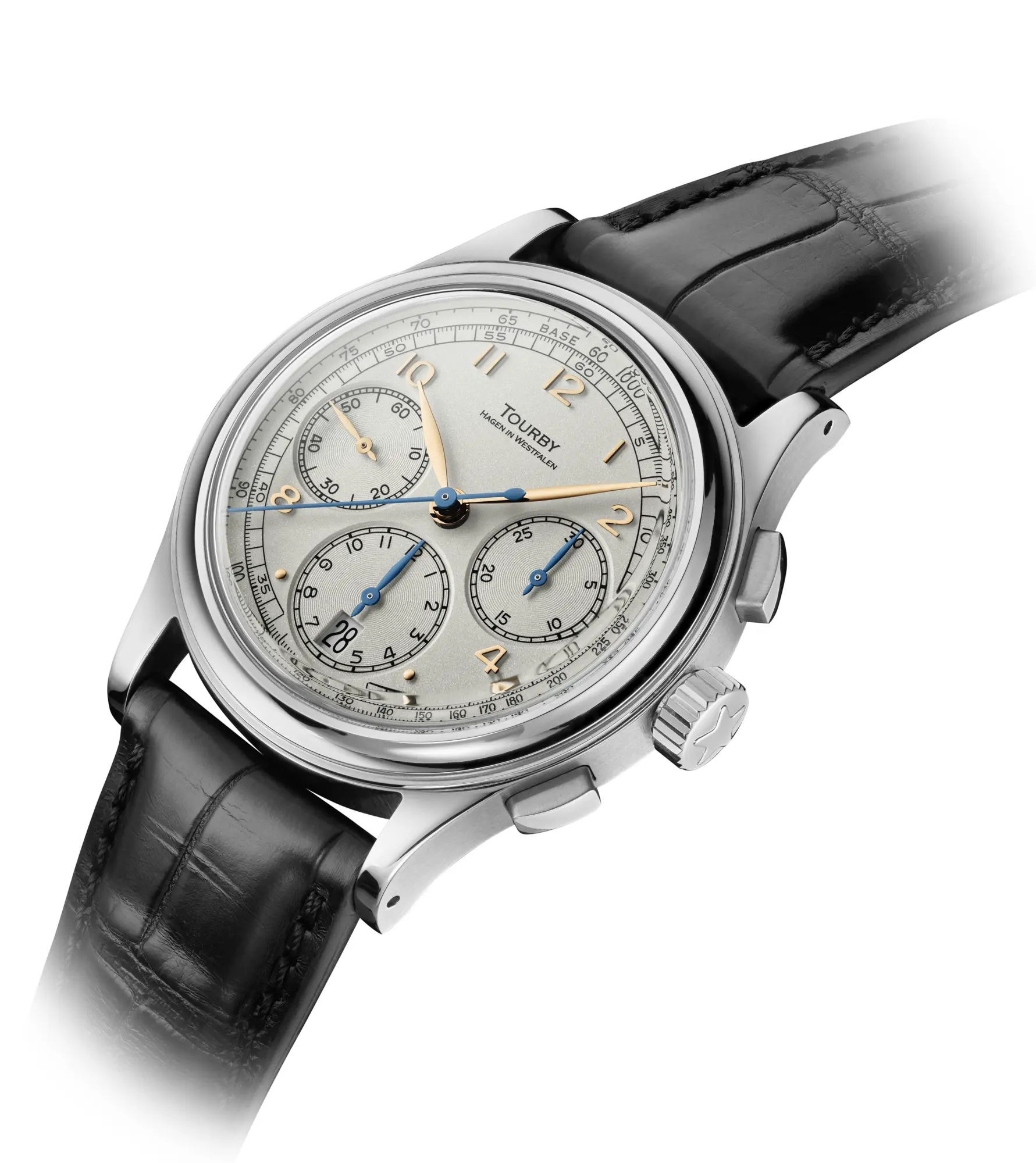 Das Modell erinnert an die goldene Zeit des Art Deco. In dieser Zeit entstanden auch die ersten Armband-Chronographen. Diese Uhren zeichnen sich aus durch die Verwendung von goldenen Appliqués. Die Zeiger für die permanente Zeitanzeige sind in Gold gehalten, die Zeiger für die Stoppuhranzeige sind aus flamm-gebläuten Stahl. Der innere Ring ist die Stoppsekundenskala. Der äußere Ring des Zifferblatts zeigt eine Tachymeterskala, zum Messen von Geschwindigkeiten. Das Ziel war, eine Uhr zu schaffen, die historischen Vorbildern gerecht wird, deren Umsetzung aber so perfekt ist, dass sie sogar die heutigen Anforderungen übertrifft.