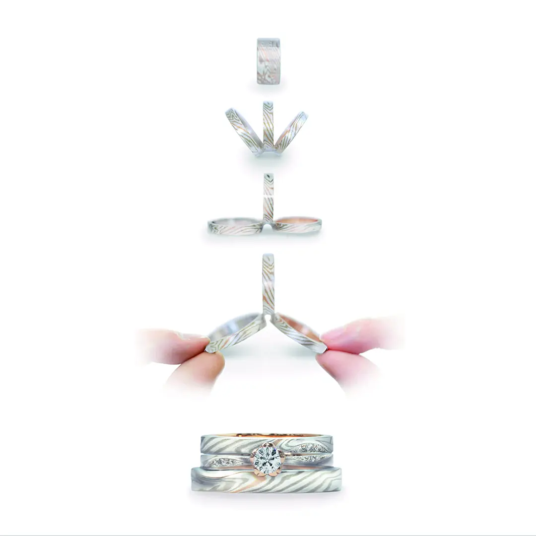 Dieser Ring wird vollendet, wenn die beiden Heiratenden ihn mit ihren eigenen Händen in drei Ringe teilen – einen Ehering und einen Verlobungsring. Jeder der drei Ringe hinterlässt eine „Spur“ als Beweis ihrer Verbindung, die Teil des Designs wird. Diese „Spur“ wird die Erinnerung an den Moment, in dem sie die Ringe teilten, für immer wachrufen und die Bindung zwischen den beiden Menschen vertiefen. Im Gegensatz zu Eheringen und Verlobungsringen, die nur physische Objekte sind, strebten wir ein Design für einen Ehering an, der die wesentliche Bedeutung der Ehe symbolisiert, indem wir eine Form schufen, die zwei Menschen als Partner verbindet.