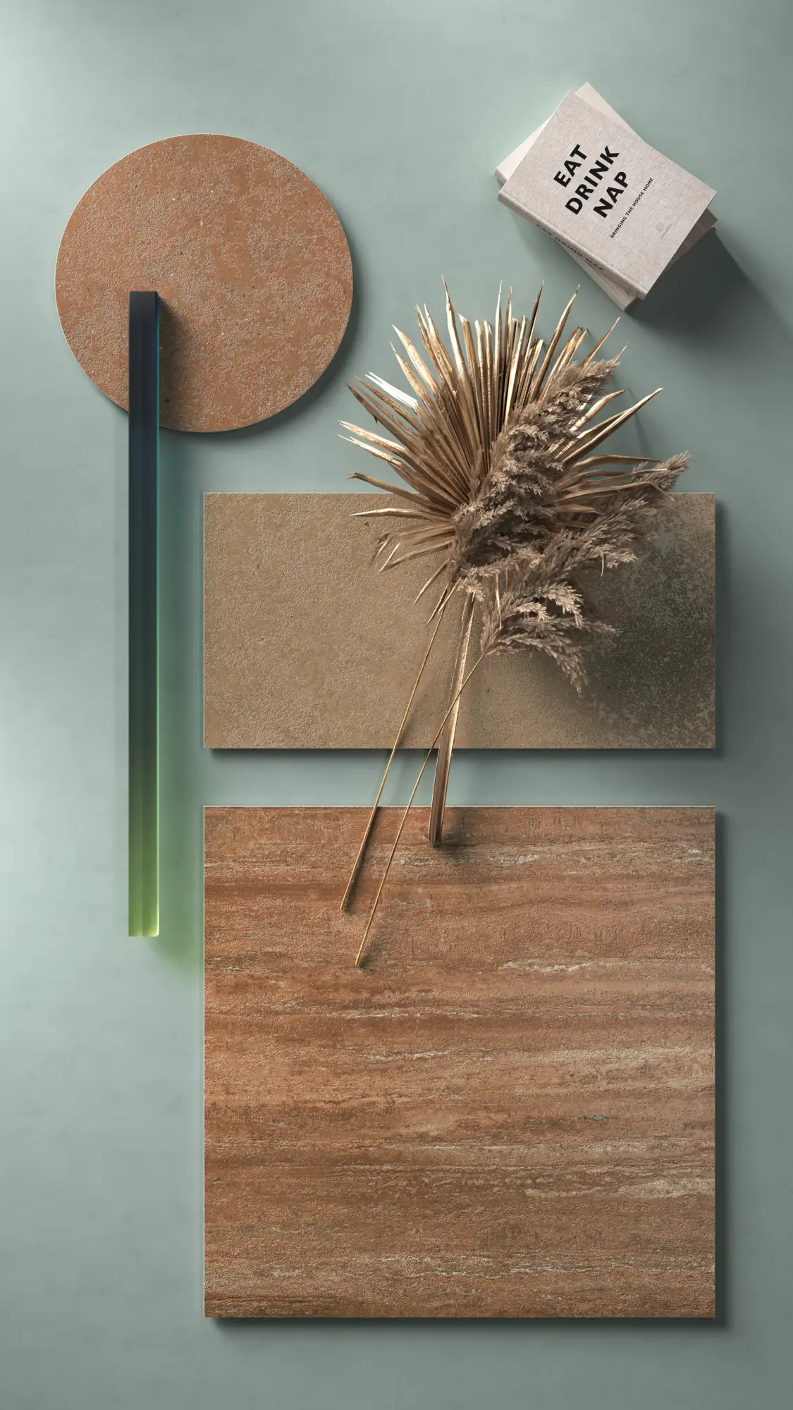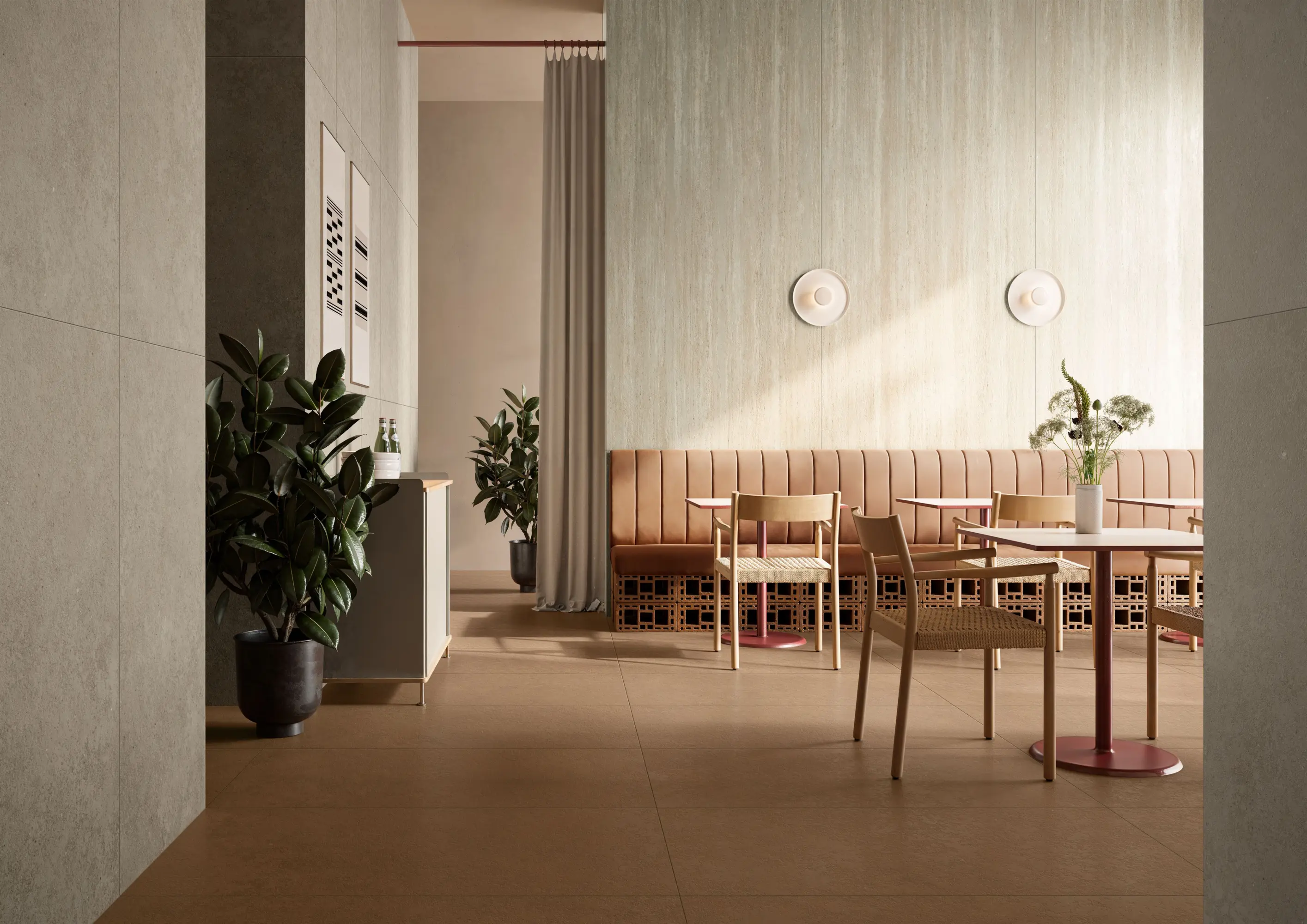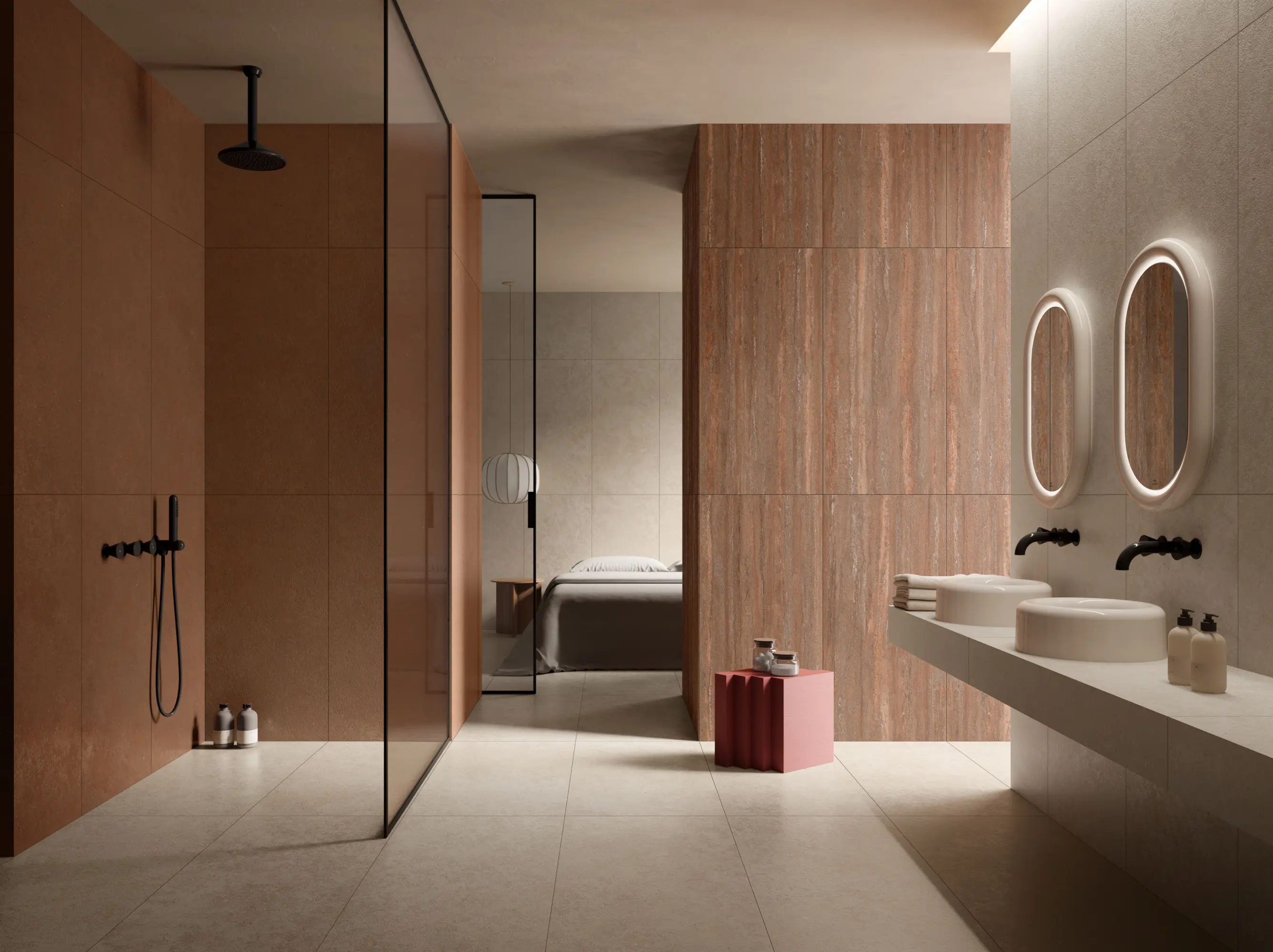 Novatone erforscht die Harmonie zwischen natürlichen und gefertigten Materialien. Die warme Kombination aus gepresster Erde und Travertin in erdigen Creme- und Cottotönen schafft geerdete, immersive Innenräume mit zeitgenössischer Weichheit. Die eingesetzte V-Shape-Technologie verleiht eine feine 3D-Reliefstruktur, die visuelle Tiefe und haptische Attraktivität steigert, während die Oberfläche angenehm weich bleibt. Als Teil des Terra-Melange-Konzepts lässt sich Novatone mit anderen VitrA-Kollektionen kombinieren und verbindet natürliche Inspiration mit Innovation für Räume voller Form und Funktion.
