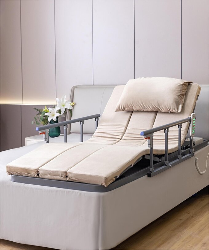 Dieses Rückenstützgerät verbessert die Pflegeerfahrung für Benutzer und Familien. Es kann direkt im Bett eingesetzt werden, wodurch Installationskosten gespart und die Flexibilität erhöht wird. Es verfügt über ein Motorsteuerungssystem, das eine sanfte Hebung und Senkung von Rücken und Beinen ermöglicht. In Kombination mit der Schnellhebetaste hilft es Benutzern, mühelos aufzustehen. Zudem bietet es eine zeitgesteuerte Funktion für das Wenden, um Druckgeschwüre durch langes Liegen zu verhindern.