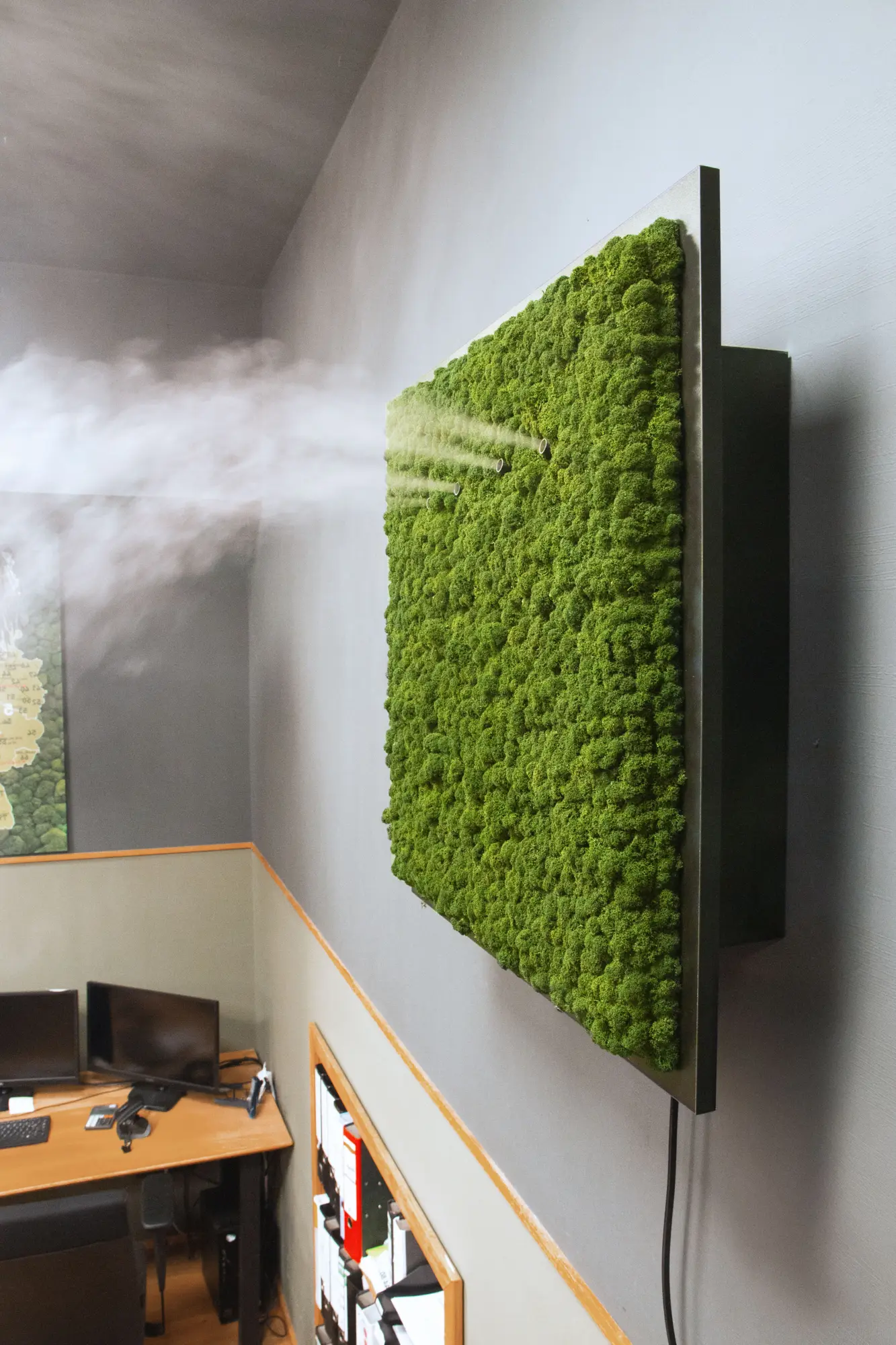 Heavens Breeze revolutioniert Raumklimatisierung durch die innovative Fusion von High-Tech und lebendiger Natur. Das wandintegrierte System kombiniert präzise Membran-Zerstäubungstechnologie mit einem bioaktiven Islandmoos-Panel, das als natürlicher Feuchtigkeitspuffer und Luftfilter agiert. Das Moos speichert Feuchtigkeit und gibt sie bedarfsgerecht ab – ein selbstregulierender Kreislauf, der auch inaktiv funktioniert. Staubpartikel werden biologisch gefiltert. Das Ergebnis: Waldfrische Luftqualität im gesamten Raum. Heavens Breeze definiert nachhaltiges Design neu – eine ästhetische Wandinstallation, die Wohlbefinden schafft.