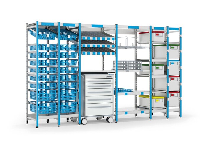 Das Systemregal setzt neue Maßstäbe in der Anpassungsfähigkeit und Ergonomie im Gesundheitswesen. Durch seinen modularen Aufbau und die werkzeuglose Verstellbarkeit bietet es eine flexible Lösung für wechselnde Anforderungen und Standorte. Die intuitive Farbgestaltung unterstützt das Klinikpersonal bei einer effizienten Organisation.