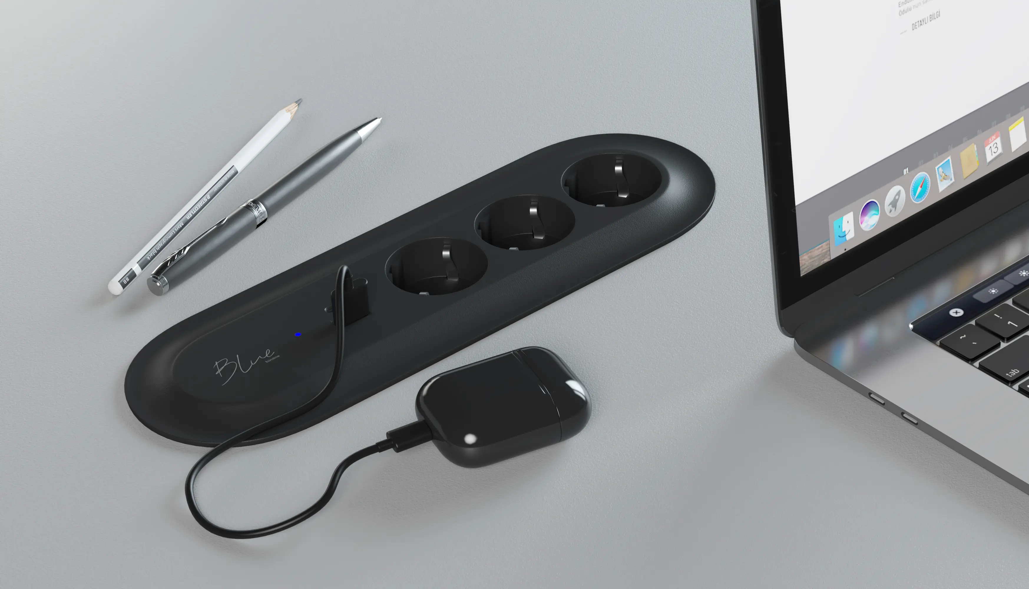 Blue, inspiriert von der mit Technologie assoziierten Farbe, ist eine vielseitige Produktfamilie, die funktionale und ästhetische Energielösungen bietet. Die Blue-Steckdose kann auf dem Schreibtisch, daneben oder in einer Kabelwanne platziert werden; ihr optionales Kabelaufwickelzubehör hält lange Kabel ordentlich organisiert. Eine tragbare Standversion mit USB-C- und USB-A-Anschlüssen liefert Strom ohne Adapter, während die obere Ablagefläche einen praktischen und eleganten Ladeplatz schafft.