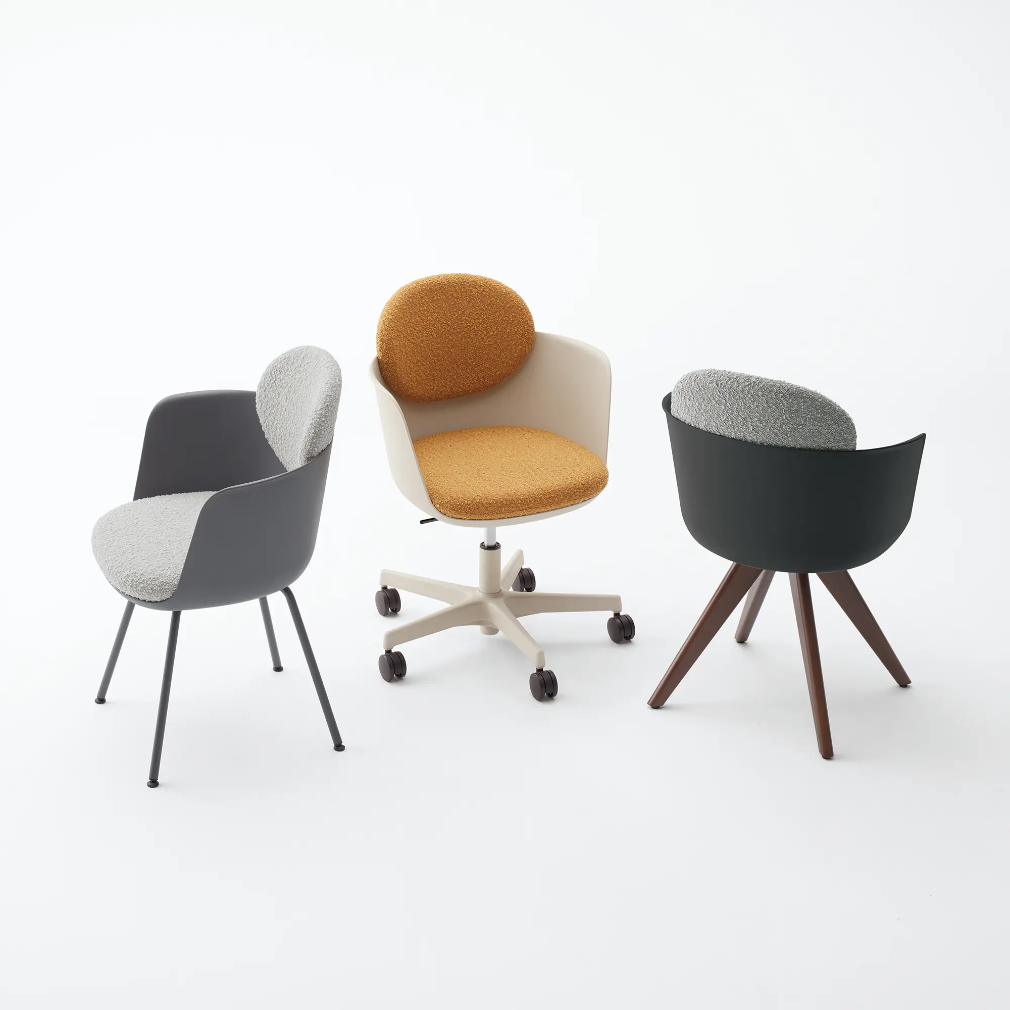 Die Möglichkeit, den Arbeitsplatz entsprechend spezieller Aktivitäten zu wählen, erlaubt eine Anpassung der Arbeit an den Arbeitsstil. Da immer mehr ungezwungene Arbeitsräume erforderlich sind, besteht ein wachsender Bedarf nach komfortablem und beruhigendem Stuhldesign. Mit seinem leichten Harzrahmen und den körperstützenden Rücken- und Sitzpolstern bietet FLORIS den Nutzern Bequemlichkeit. Das Gewebematerial gibt dem Raum zusätzlich einen weichen Akzent, so dass die Benutzer sich dort sicher fühlen.