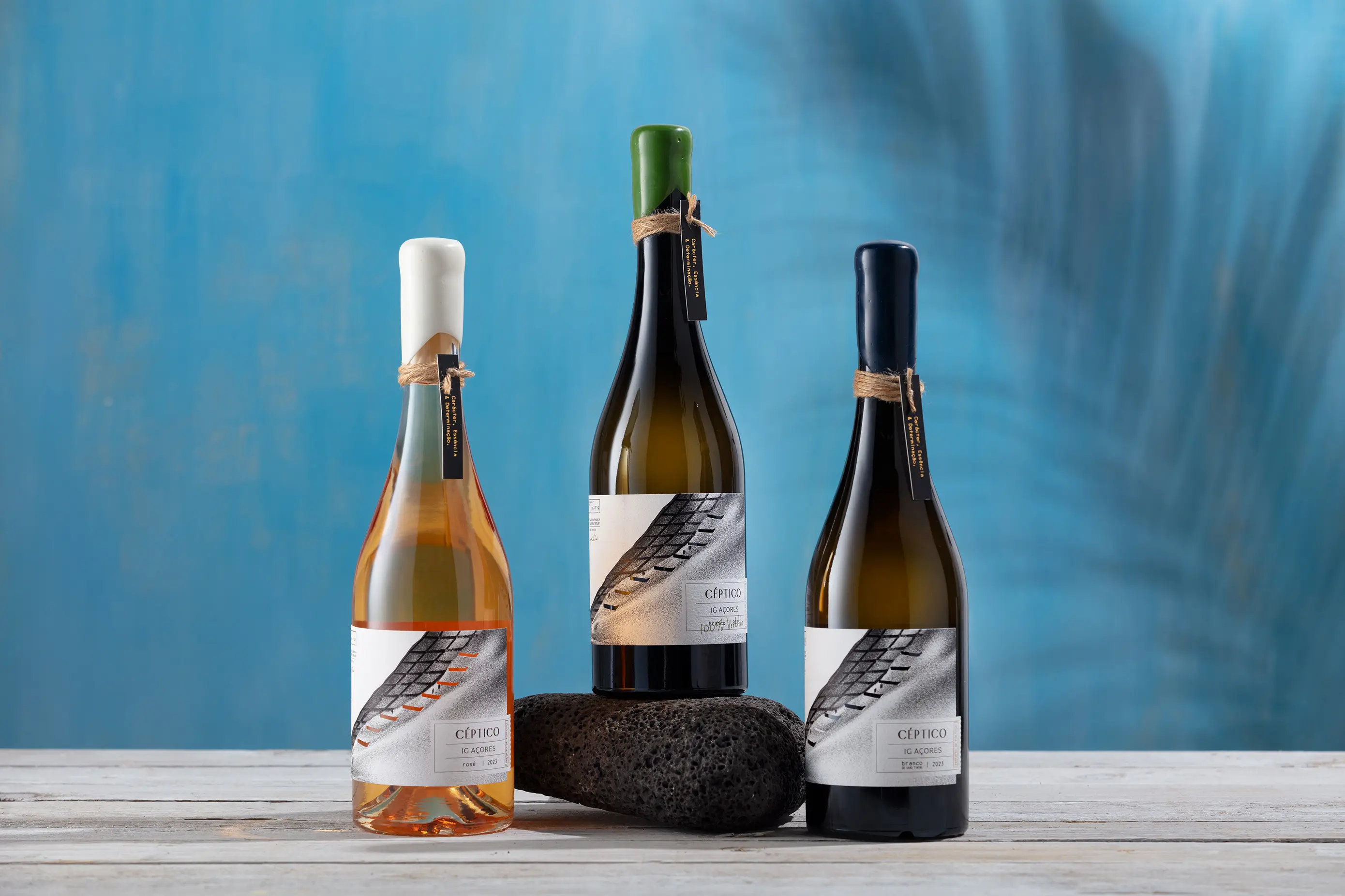 Geboren auf vulkanischem Land, umarmt vom Atlantik, zollt dieses Etikett 600 Jahren Weinbautradition auf der Azoreninsel Santa Maria Tribut. Inspiriert von ihrer dramatischen Geografie, erinnert das Kohledesign an Meer, Klippen und Hügel, während diskrete Figuren kollektive Arbeit symbolisieren. Ausstanzungen deuten Terrassen und Tiefe an und machen das Etikett zu einem taktilen Relief. Klare Typografie sorgt für Balance, ein Seil um den Hals verweist auf die maritime Tradition. Ein handgeschriebener Anhänger fügt Wärme und Authentizität hinzu.