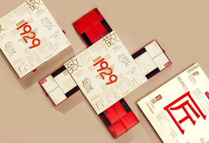 Die Mondkuchen-Geschenkbox „Respekt vor der Handwerkskunst“ zeichnet sich durch eine einfache quadratische Form aus, mit einem Innenraum, der aus vier Schubladen besteht, die sich in verschiedenen Richtungen öffnen. Die Schubladen stützen sich gegenseitig im äußeren Kasten und repräsentieren die Aromen u. Zutaten aus dem ganzen Land sowie Mondkuchen mit regionalen Geschmacksrichtungen. Auf der Vorderseite ist das Bild der Changxin-Palastlaterne aus der Zeit der Westlichen Han-Dynastie vor über 2000 Jahren zu sehen, die als die bedeutendste Laterne Chinas verehrt wird und für filigranes Design u. fortschrittliches Umweltbewusstsein bekannt ist.