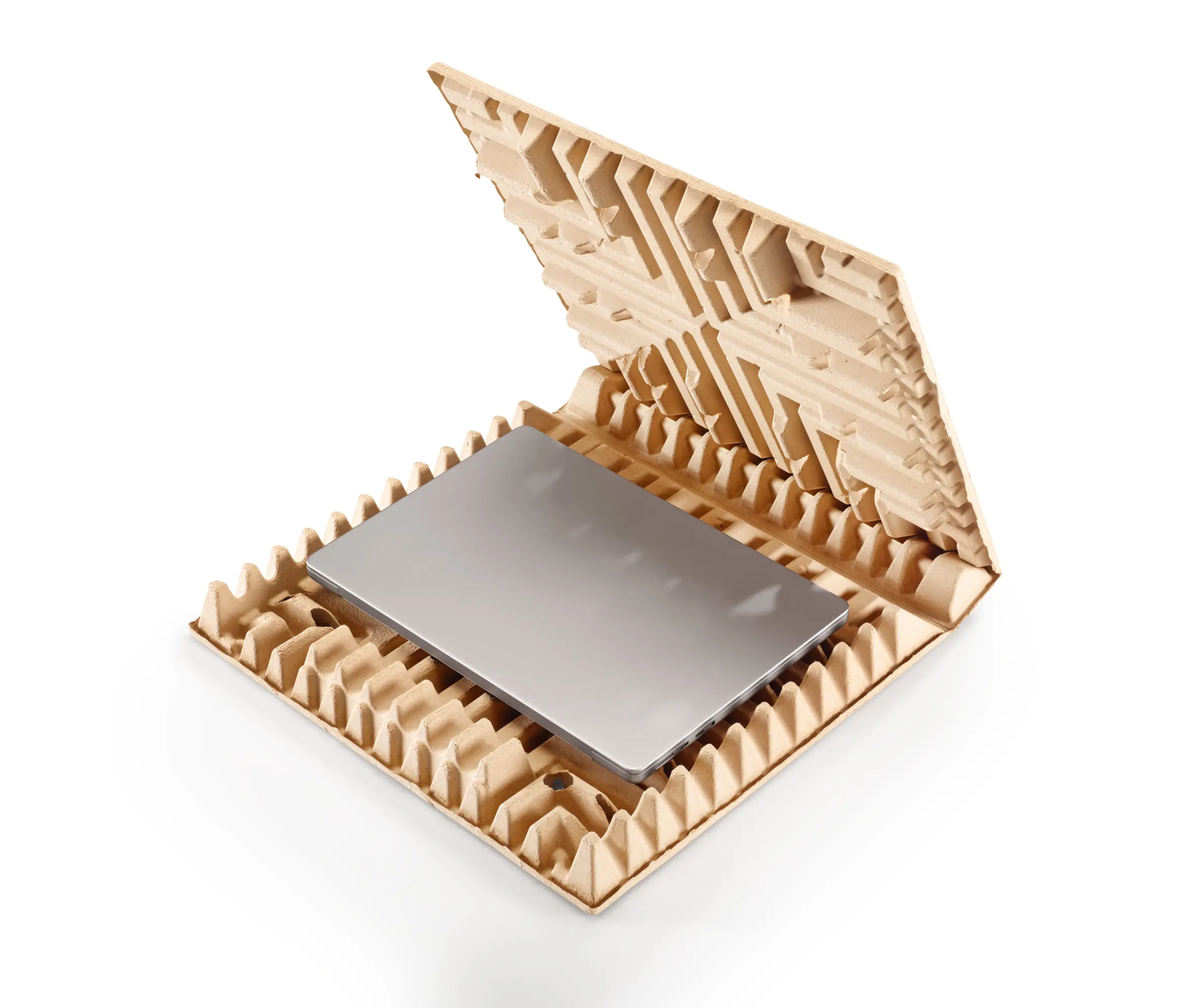 Das innovative Faserguss-Polster von buhl-paperform bietet eine nachhaltige, klappbare Schutzlösung für flache, empfindliche Produkte wie Tablets, Laptops, Displays oder Keramik, etc. Es besteht aus bis zu 100 % Altpapier, ist vollständig recyclingfähig, einfach zu entsorgen (über blaue Tonne) und lässt sich einfach in bestehende Verpackungsprozesse integrieren. Durch seine intelligente Form schützt es zuverlässig vor Stößen und Bruch, reduziert Material- und Kosteneinsatz sowie Lager- und Transportfläche und unterstützt Unternehmen bei der Reduzierung des CO2-Fußabdrucks.