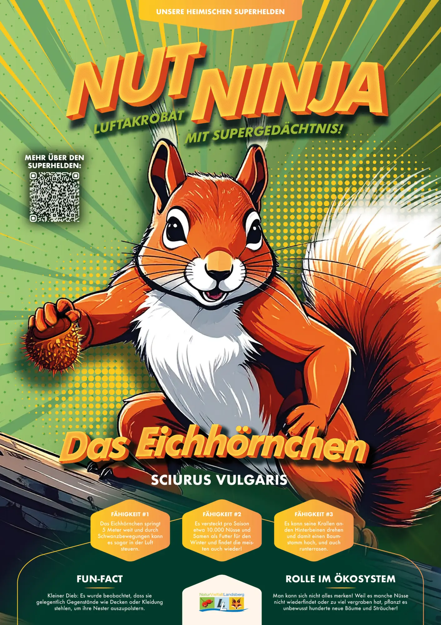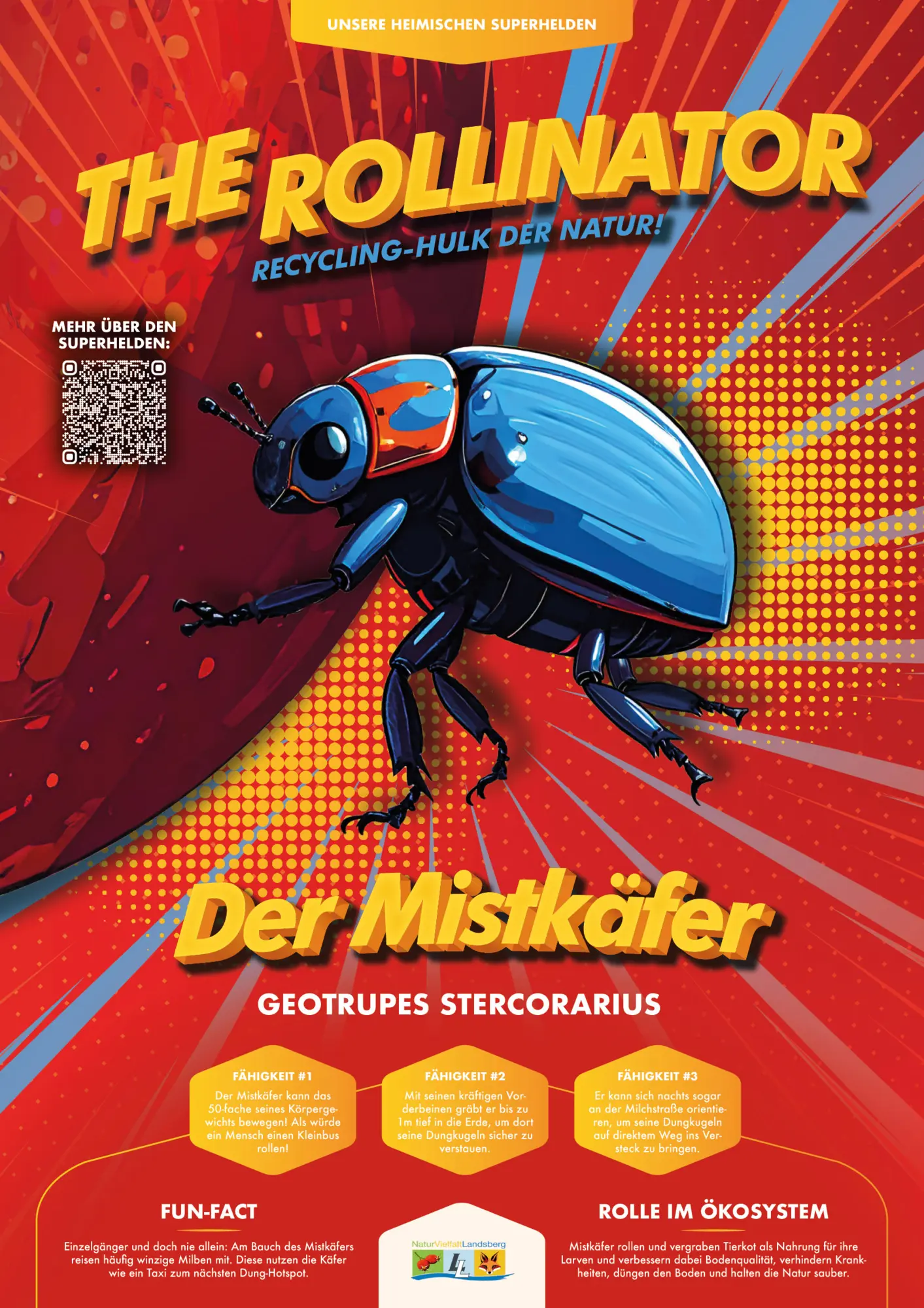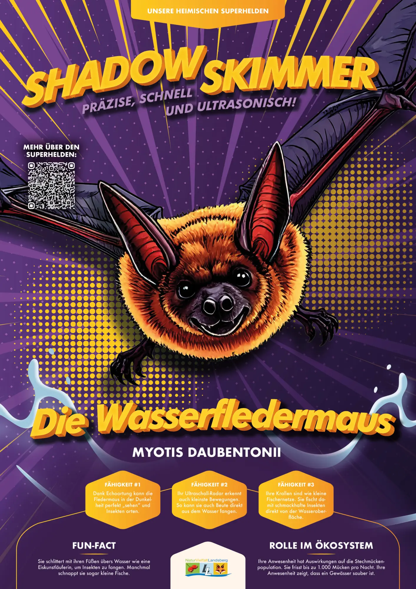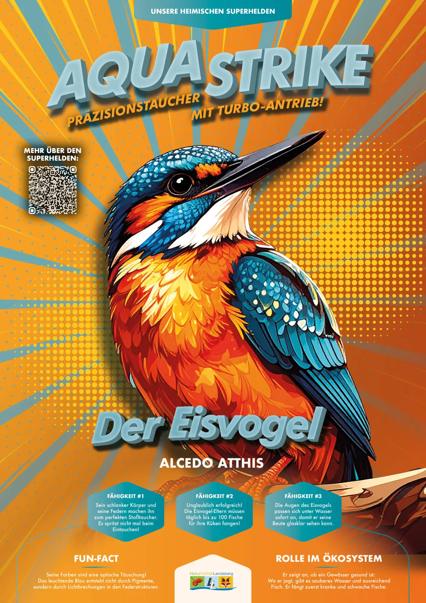 Plakatserie für "Heimische Superhelden" – verschiedene heimische Tiere mit Superkräften – gestaltet im Marvel-Comic-Stil für den Biologieunterrischt an bayrischen Grundschulen. Auftraggeber war die Naturschutzbehörde des Landratsamts Landsberg am Lech.