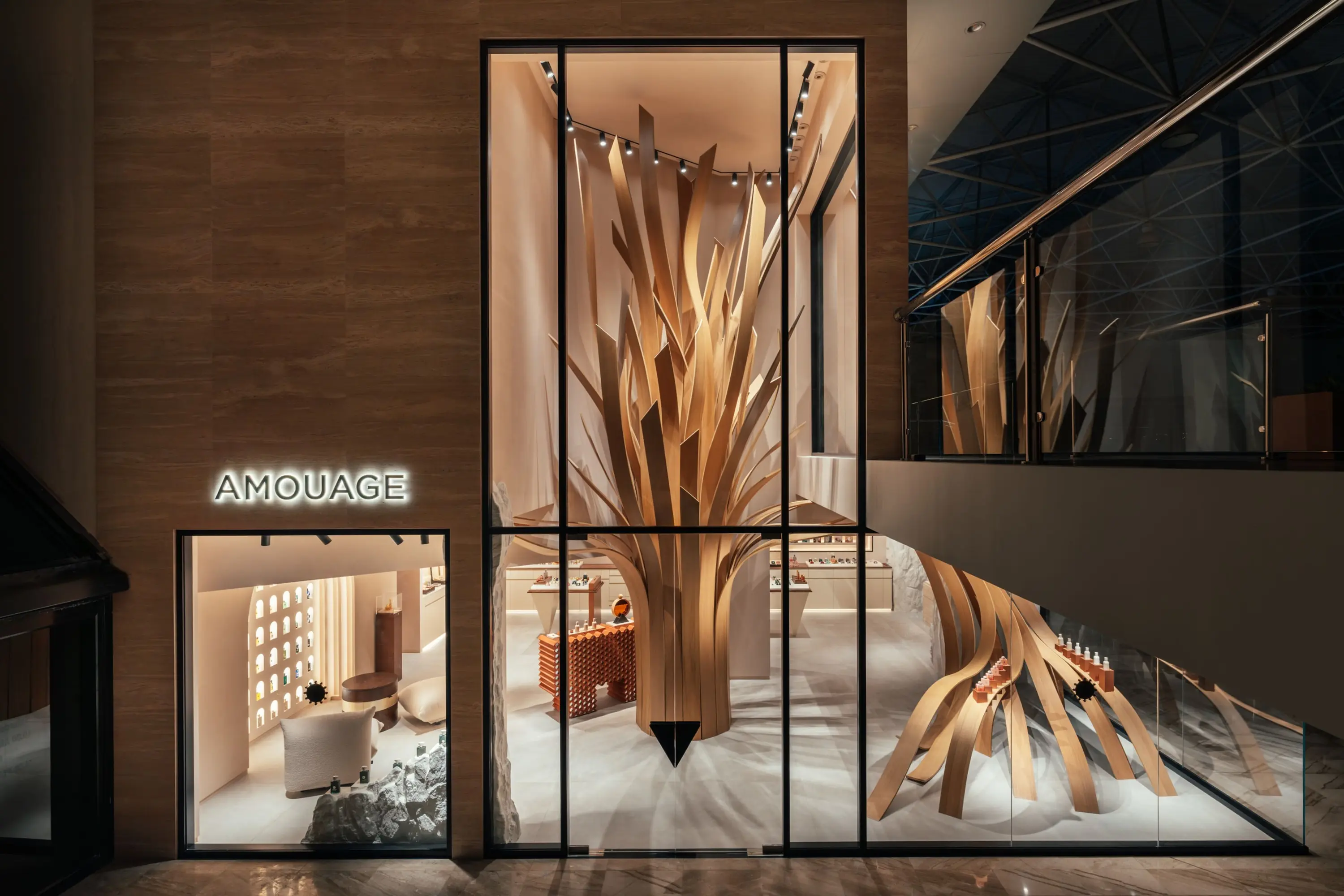 Amouages The Sacred Tree Boutique in Muscat verwandelt den Ursprungsort der Marke in ein skulpturales, immersives Flagship. Entworfen von Héroïne, durchbricht ein sieben Meter hoher Weihrauchbaum zwei Etagen – ein architektonisches Meisterwerk. Die Boutique ist plastikfrei, vollständig lokal gefertigt und wird mit Solarenergie betrieben. Auf temporäre Displays wurde verzichtet. Materialien wie Travertin, Eiche und Messing spiegeln omanisches Erbe wider. Das Ergebnis: ein emissionsarmer Raum, in dem Design, Kultur und Erzählung verschmelzen.
